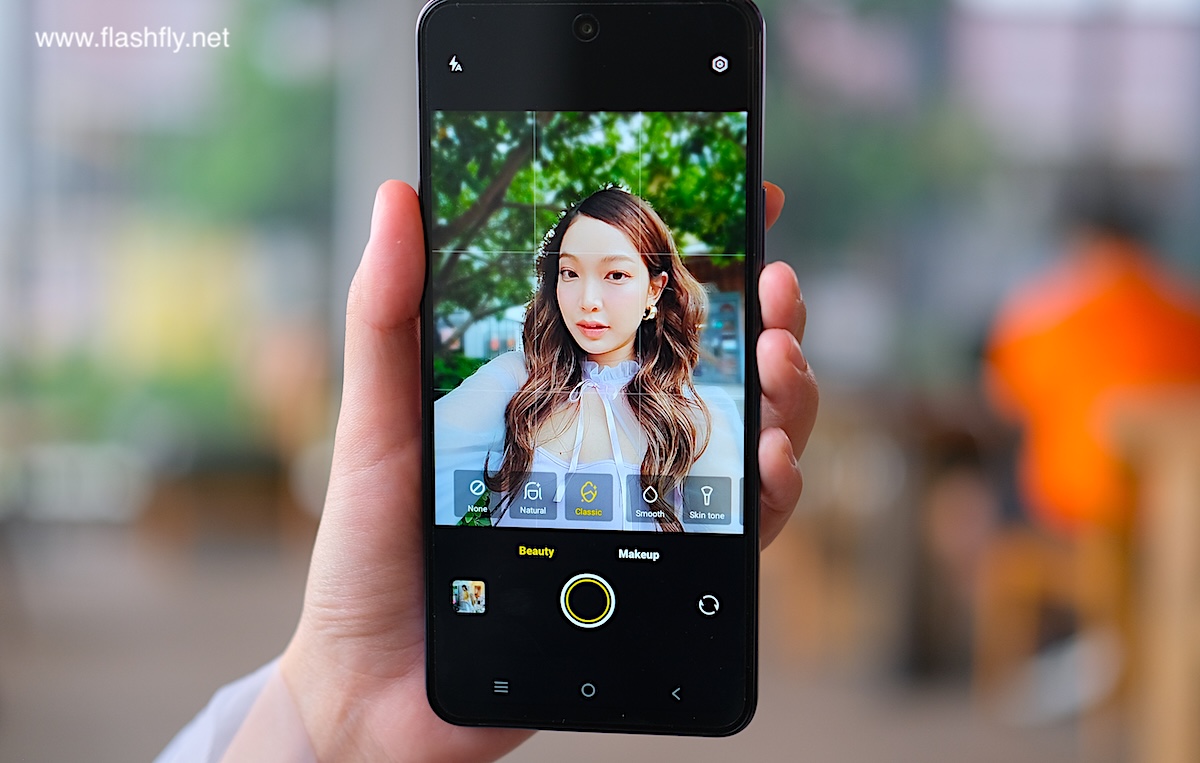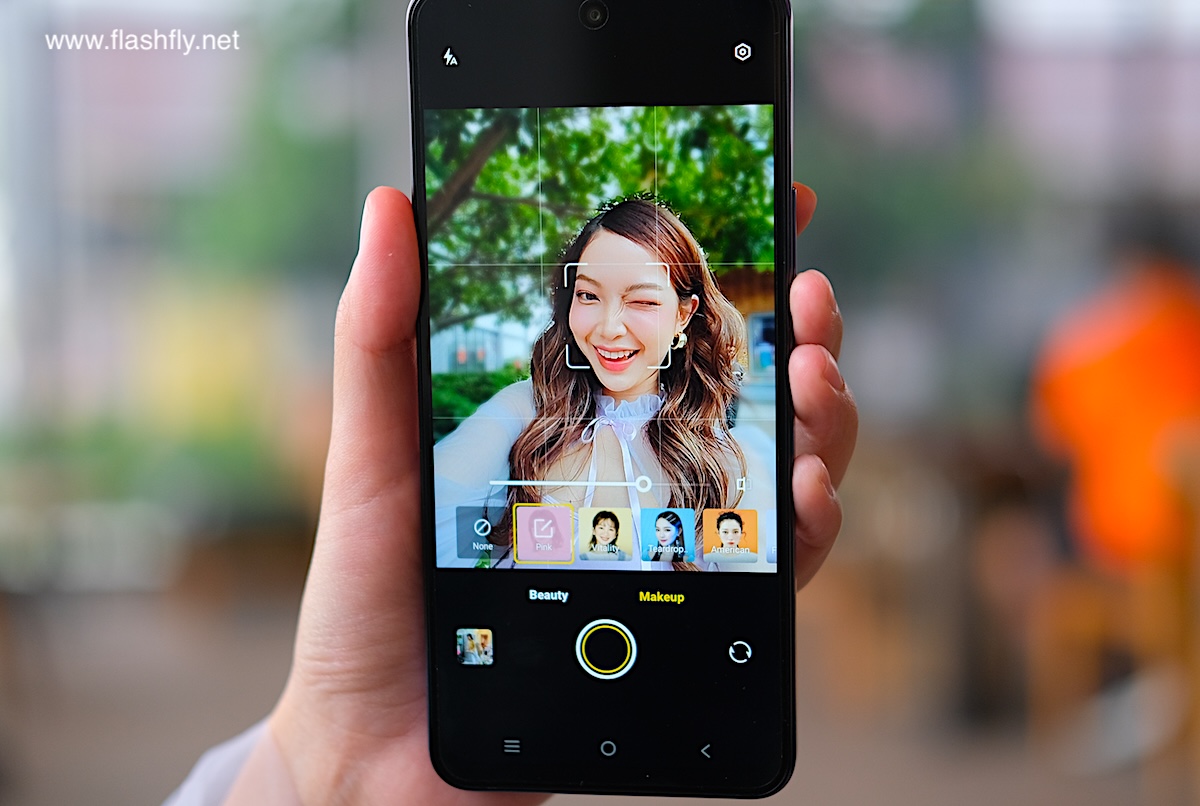 โหมด Portraitของกล้องหน้ามี Styles ให้เลือกหลายแบบ ถัดลงมาเป็นฟีเจอร์ Beauty รวมถึง Makeup สำหรับปรับใบหน้าให้ดูดีขึ้น และไอคอนล่างสุดสำหรับปรับเอฟเฟกต์ Bokeh ละลายฉากหลัง