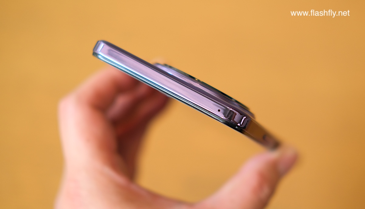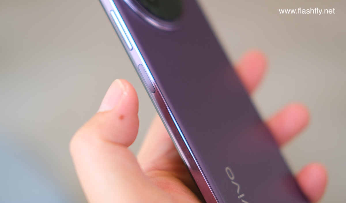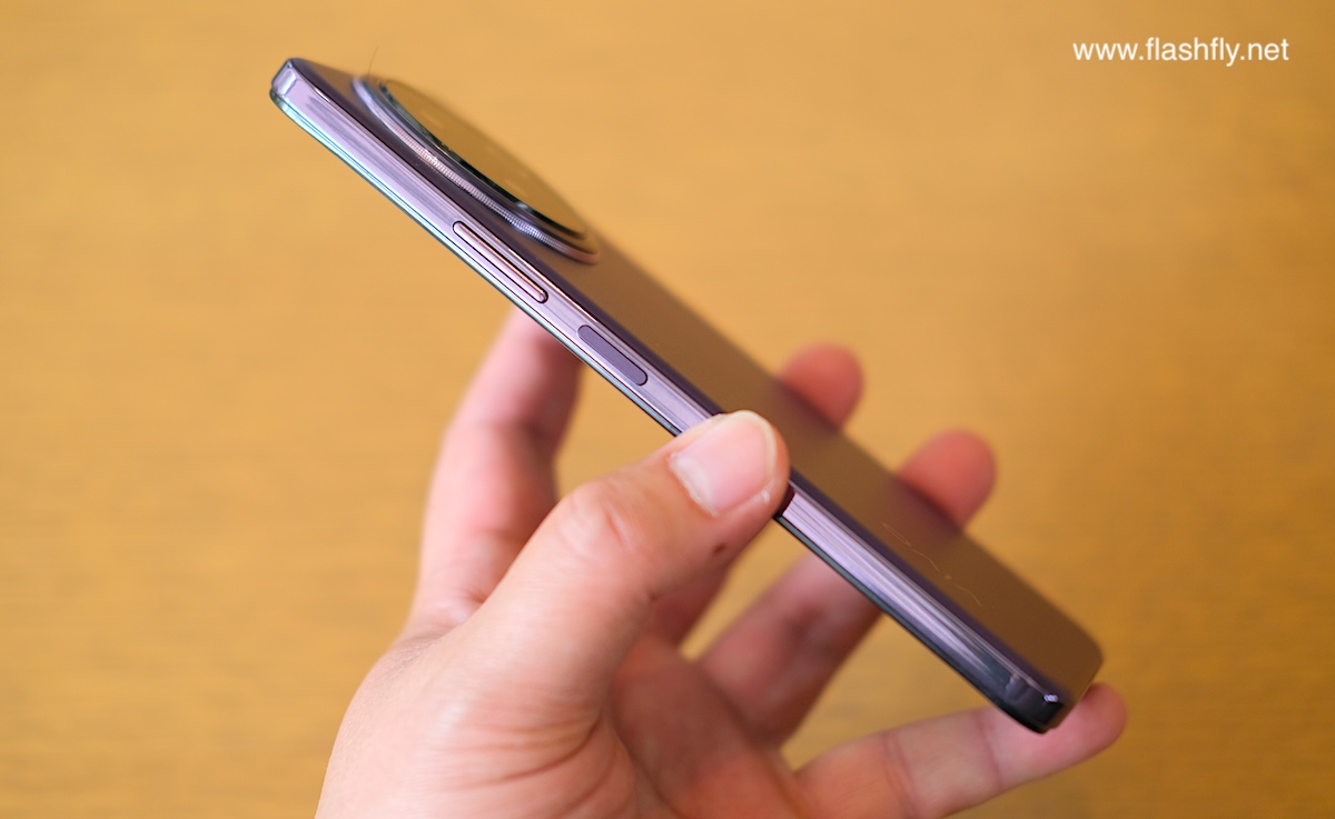 ปุ่มด้านข้าง ประกอบด้วย ปุ่มปรับระดับเสียง ถัดลงมาเป็นปุ่มเพาเวอร์ พร้อมติดตั้งเซ็นเซอร์สแกนลายนิ้วมือรวมไว้กับปุ่มเพาเวอร์ด้วย