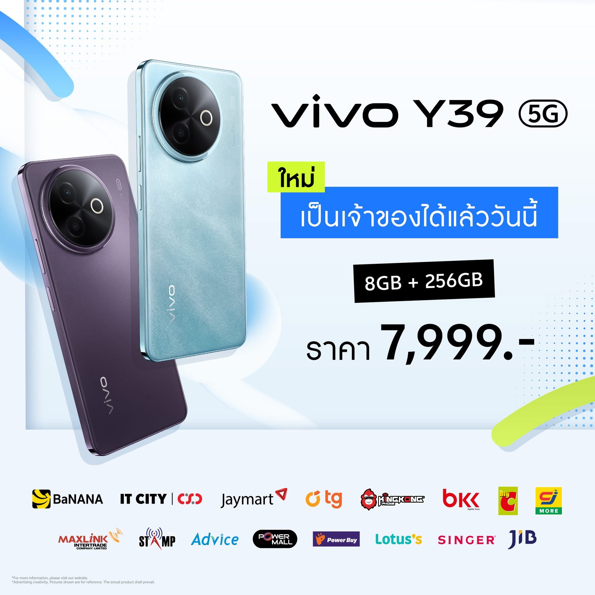 vivo Y39 5G วางจำหน่ายอย่างเป็นทางการ พร้อม “เอาอยู่ทุกความท้าทาย” ไปกับผู้ใช้งานชาวไทยที่หน้าร้าน vivo Brand Shop ทุกสาขา ช่องทางออนไลน์ และตัวแทนจำหน่ายทั่วประเทศแล้ววันนี้ ในราคาเพียง 7,999 บาท สำหรับความจุ 8GB + 256GB