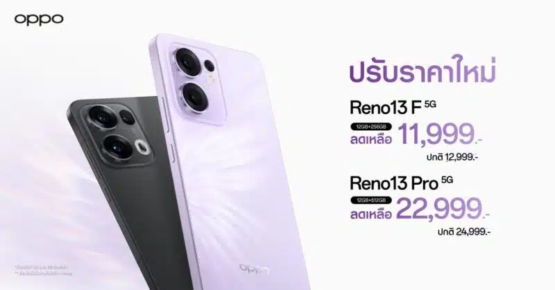 OPPO Reno13 F 5G และ OPPO Reno13 Pro 5G อัปเกรดประสบการณ์ถ่ายภาพด้วย AI Livephoto พร้อมการประมวลผลทรงพลัง และครั้งแรกของการถ่ายภาพใต้น้ำด้วยมาตรฐาน IP69 อัปเกรดประสบการณ์การถ่ายภาพพอร์ตเทรตให้โปรยิ่งขึ้นด้วย AI Livephoto พร้อมมอบประสบการณ์ใช้งานที่คุ้มในราคาที่คุ้มค่ายิ่งขึ้น สำหรับ OPPO Reno13 F 5G (12+256GB) มาในราคาใหม่สุดพิเศษ 11,999 บาท จากราคาปกติ 12,999 บาท และพิเศษยิ่งกว่านั้น OPPO Reno13 Pro 5G (12+512GB) มาในราคาใหม่ 22,999 บาท จากราคาปกติ 24,999 บาท ตั้งแต่วันที่ 25 เมษายน 2568 OPPO Reno13 F 5G นำทุกเทรนด์ด้วย OPPO AI อัปเกรดประสบการณ์ถ่ายภาพด้วย AI ที่ดีที่สุด