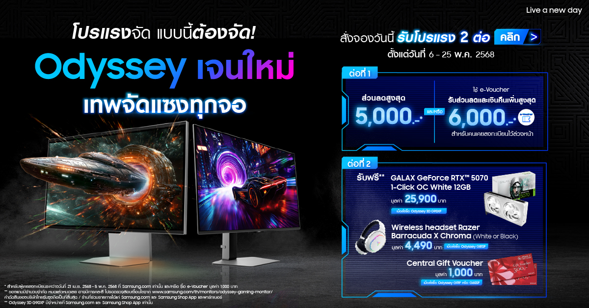 เป็นเจ้าของ Odyssey เจนใหม่ พร้อมรับข้อเสนอพิเศษสุดคุ้ม 2 ต่อ สำหรับผู้ลงทะเบียนล่วงหน้าเท่านั้น! ลงทะเบียนเพื่อรับข่าวสารและข้อเสนอพิเศษ | Samsung Thailand ตั้งแต่วันนี้ ถึง 5 พฤษภาคม 2568 ที่ Samsung.com และแอป Samsung Shop