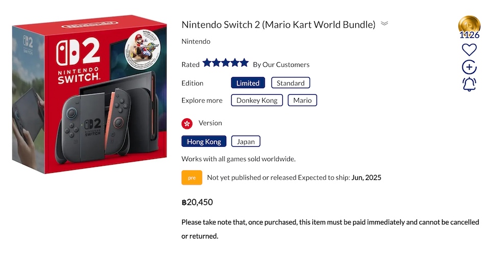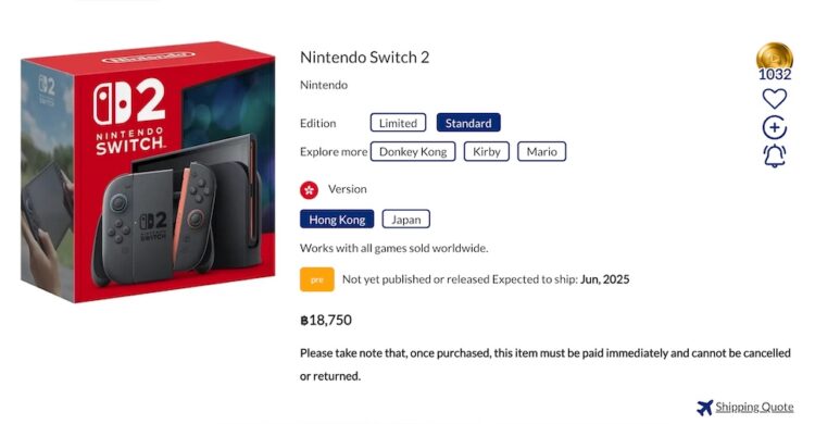 ร้านออนไลน์ Playasia ที่เน้นจำหน่ายผลิตภัณฑ์เกี่ยวกับเกมโดยเฉพาะ เปิดรับจอง Nintendo Switch 2 บนเว็บไซต์แล้ว โดยเป็นเวอร์ชันฮ่องกงที่รองรับเกมทั่วโลก และวางจำหน่ายในราคา 18,750 บาท สำหรับรุ่นมาตรฐาน