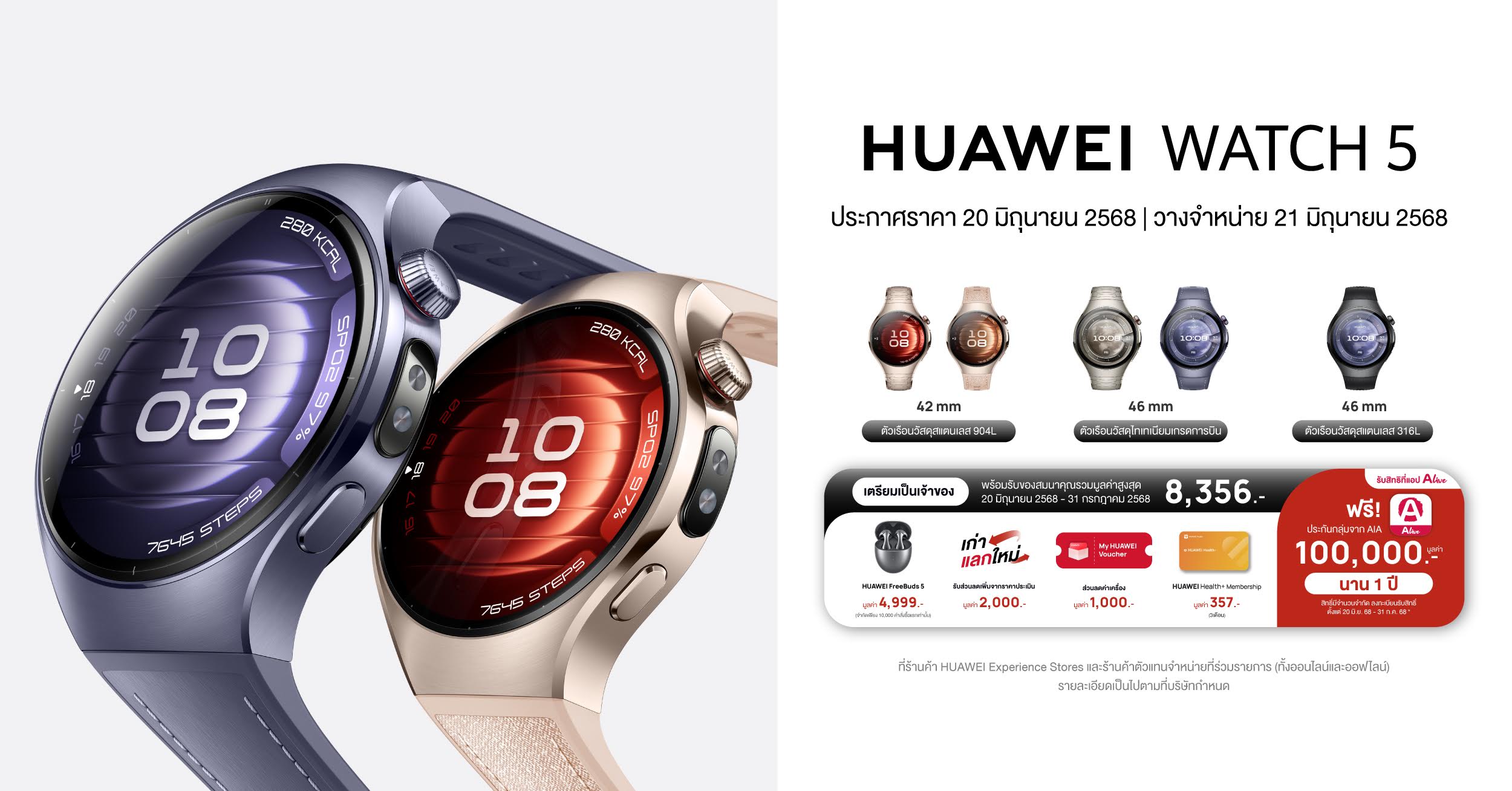 HUAWEI WATCH 5 เตรียมประกาศราคาไทยในวันที่ 20 มิถุนายน 2568 มอบประสบการณ์สมาร์ทวอชระดับเรือธงกับราคาที่คุ้มค่ากว่าระดับโลก พร้อมข้อเสนอรับของสมนาคุณรวมมูลค่าสูงสุด 8,356 บาท ตั้งแต่วันที่ 20 มิถุนายน 2568 – 31 กรกฏาคม 2568 ประกอบด้วย HUAWEI FreeBuds 5 ราคา 4,999 บาท (จำกัดเพียง 10,000 คำสั่งซื้อแรกเท่านั้น) สิทธิ์เก่าแลกใหม่และรับส่วนลดเพิ่มจากราคาประเมินมูลค่า 2,000 บาท My HUAWEI Voucher ส่วนลดค่าเครื่อง มูลค่า 1,000 บาท และ HUAWEI Health+ Membership มูลค่า 357 บาท (3 เดือน) และสิทธิ์ที่แอป Alive ฟรี ประกันกลุ่มจาก AIA มูลค่า 100,000 บาท นาน 1 ปี สิทธิ์มีจำนวนจำกัด ลงทะเบียนรับสิทธิ์ตั้งแต่ 20 มิถุนายน 2568 – 31 กรกฎาคม 2568