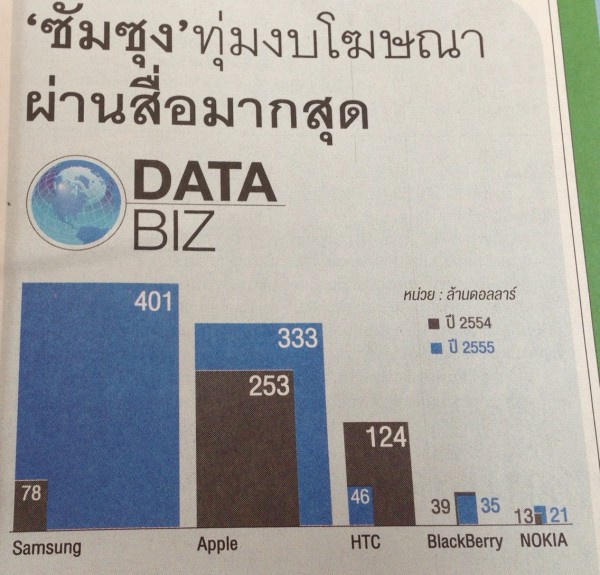 ในสมรภูมิการแข่งขันของธุรกิจสมาร์ทโฟน Samsung ยังครองแชมป์ทุ่มงบโฆษณาผ่านสื่อต่างๆ มากที่สุด ไม่ว่าจะเป็นสื่อโทรทัศน์ สิ่งพิมพ์ บิลบอร์ด และอินเทอร์เน็ต โดยปี 2555 Samsung หว่านงบโฆษณาในสื่อเหล่านี้มากถึง 401 ล้านดอลลาร์ เพิ่มขึ้นหลายเท่าตัวจากปี 2554 ที่ใช้งบแค่ 78 ล้านดอลลาร์