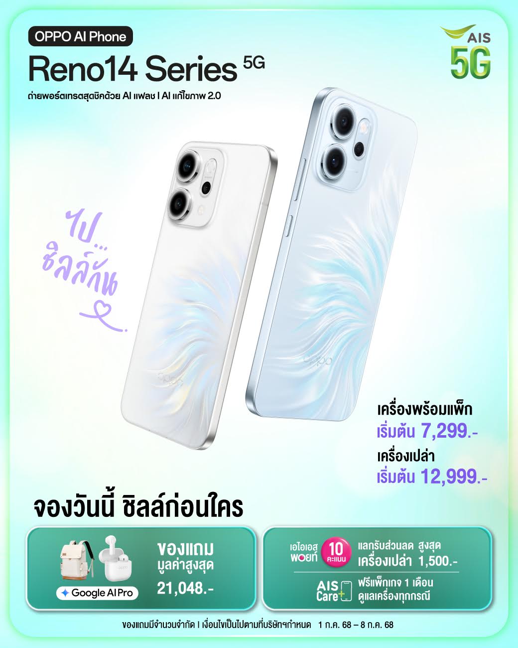 ลูกค้า AIS สั่งซื้อ OPPO Reno14 Series 5G ในราคาสุดพิเศษ ไม่ว่าจะเป็น ซื้อเครื่องพร้อมแพ็กเกจในราคาเริ่มต้นเพียง 7,299 บาท หรือรับส่วนลดสูงสุด 10,000 บาท, ใช้เอไอเอสพอยท์ 10 คะแนน แลกรับส่วนลดสูงสุด 1,500 บาท เมื่อซื้อเครื่องเปล่าไม่ติดสัญญา, รับฟรี AIS Care+ แพ็กเกจดูแลเครื่องทุกกรณีนาน 1 เดือน, รับของแถมแบบ Exclusive มูลค่าสูงสุด 21,048 บาท นอกจากนี้ยังได้รับสิทธิ์ส่วนลดพิเศษมูลค่าสูงสุด 1,000 บาท เมื่อจอง OPPO Reno14 Series และซื้อ OPPO Pad SE รุ่น LTE และ OPPO Watch X2 Mini