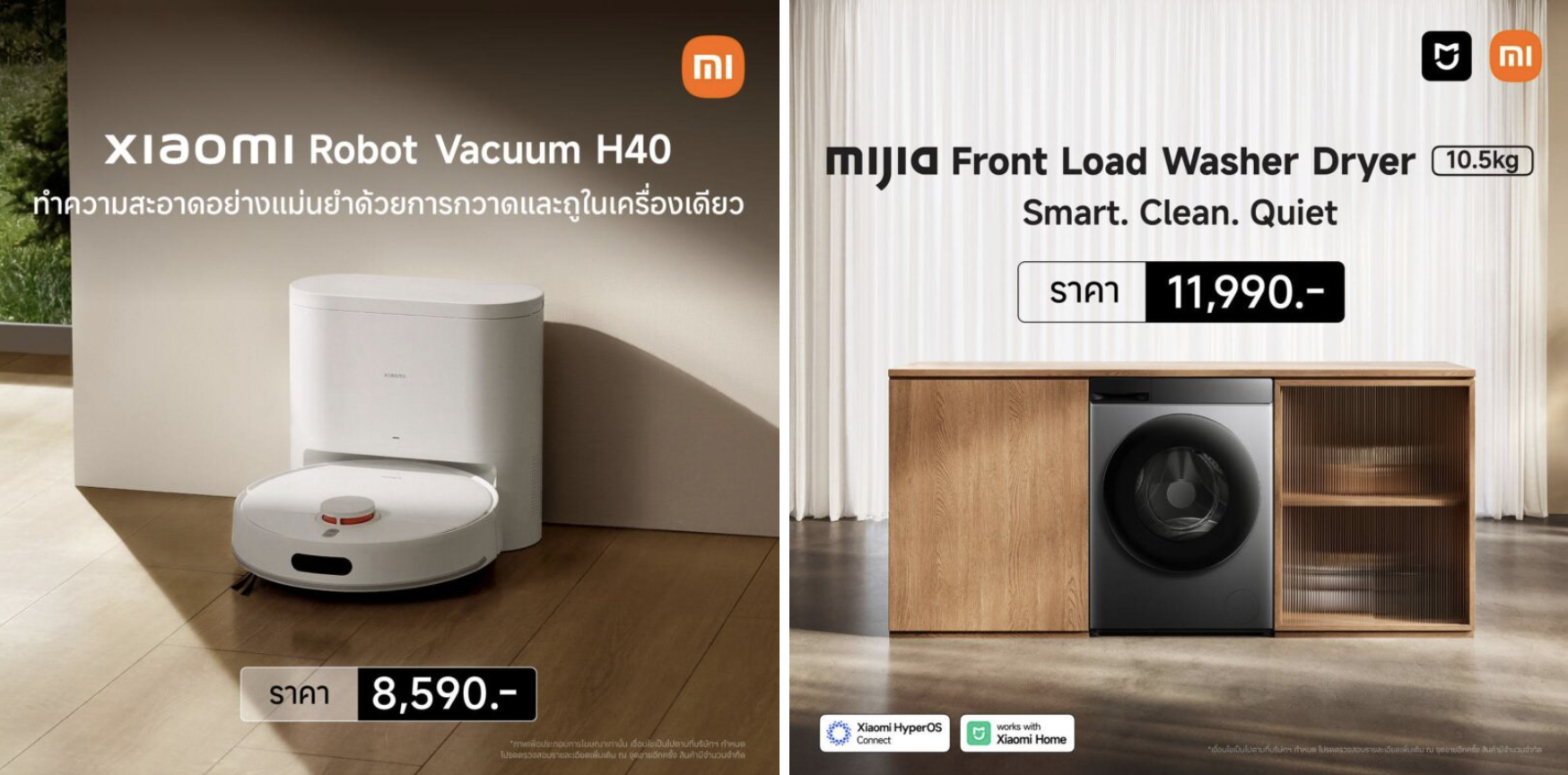 เสียวหมี่ ประเทศไทย วางจำหน่ายเครื่องซักผ้า Mijia Front Load Washer Dryer 10.5kg ในราคา 11,990 บาท และหุ่นยนต์ดูดฝุ่น Xiaomi Robot Vacuum H40 ในราคา 8,590 บาท อย่างเป็นทางการในประเทศไทย