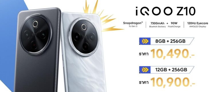 iQOO Z10 วางจำหน่ายในประเทศไทยอย่างเป็นทางการบน 2 รุ่นความจุ ได้แก่ 12GB + 256GB ในราคา 10,900 บาท และ 8GB + 256GB ในราคา 10,490 บาท