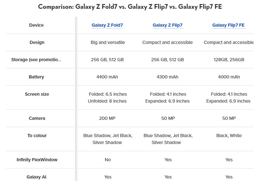 Galaxy Z Flip7 จะมาพร้อมจอแสดงผลด้านนอก 4.1 นิ้ว จอหลัก 6.9 นิ้ว มีให้เลือก 3 สี ได้แก่ Blue Shadow, Silver Shadow และ Jet Black (ข้อมูลจาก Evan Blass ระบุว่าจะมาในสี Jet black, Blue shadow และ Coral red) พื้นที่เก็บข้อมูลในตัว 256GB / 512GB ความจุแบตเตอรี่ 4300mAh กล้องหลัก 50 ล้านพิกเซล