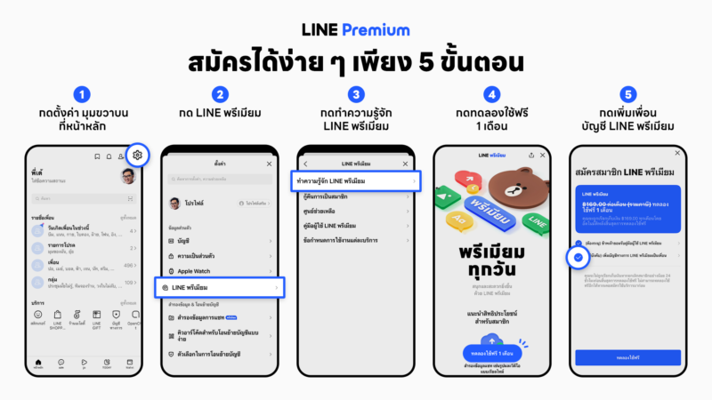 สมัคร LINE Premium ได้แล้ววันนี้ ทดลองใช้ฟรี 1 เดือน ได้ที่ https://lin.ee/C40rCpG/wcvn (กดผ่านมือถือเท่านั้น) หรือไปยังแถบ “หน้าหลัก” ในแอปฯ LINE เลือก “ตั้งค่า” เลือก “LINE Premium” และเลือก “ทำความรู้จัก LINE Premium” เพื่อกดยอมรับข้อกำหนดให้เรียบร้อย และกด “ทดลองใช้ฟรี 1 เดือน” โดยจะทำการเชื่อมต่อกับระบบชำระเงินผ่าน App Store หรือ Google Play ผู้สนใจ สามารถเพิ่มบัญชีทางการเพื่อรับข่าวสารล่าสุดจาก LINE Premium ได้แล้วที่ @line_premium_th