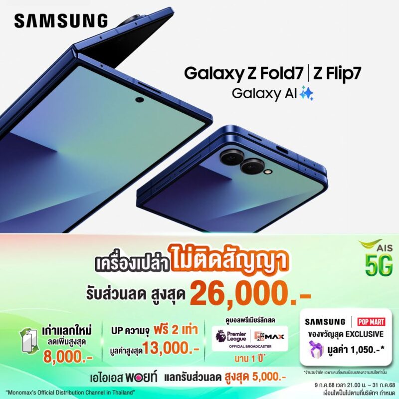 พิเศษสุด!! สำหรับลูกค้าที่ลงทะเบียนความสนใจและสั่งจองล่วงหน้า AIS เสิร์ฟความบันเทิงจัดเต็ม กับแพ็กเกจ PLAY PREMIER ชมสดพรีเมียร์ลีกครบทุกแมตช์ และเอฟเอคัพ บน AIS PLAY พร้อมหนัง ซีรีส์ พากย์ไทยบน MONOMAX แบบไม่มีค่าใช้จ่าย นาน 12 เดือน มูลค่า 2,999 บาท พร้อมรับของขวัญสุด Exclusive จากซัมซุง x POP MART และรับฟรี Power Adapter 25W มูลค่า 690 บาท สำหรับลูกค้าที่สนใจเป็นเจ้าของ Samsung Galaxy Z Flip7 หรือ Samsung Galaxy Z Fold7 สามารถจองล่วงหน้ากับ AIS ได้ตั้งแต่วันนี้ – 31 กรกฎาคม 2568