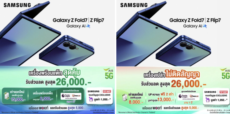 AIS 5G ในฐานะผู้บริการดิจิทัล 5G ที่มีโครงข่ายครอบคลุมพื้นที่การใช้งานมากที่สุด มอบประสบการณ์ Ultra Unfolds เหนือกว่าที่เคยพับ มาพร้อมความล้ำหน้าครั้งใหม่ของ Galaxy AI ที่จะปลดล็อกทุกการใช้งานได้อย่างเต็มประสิทธิภาพ บนโครงข่ายอัจฉริยะ 5G ที่ดีที่สุด กับ Samsung Galaxy Z Flip7 และ Galaxy Z Fold7 และพิเศษยิ่งขึ้น โดยลูกค้า AIS เท่านั้น ที่ใช้สมาร์ทโฟนรุ่นดังกล่าวบนเครือข่าย 5G จะได้สัมผัสกับเทคโนโลยีสุดล้ำ ครั้งแรกของเอเชียตะวันออกเฉียงใต้ อย่าง 3CC (3 Component Carrier) ที่ผสานการทำงานของคลื่น 5G สามย่านความถี่ทำให้มอบประสบการณ์การใช้งานที่เร็วแรงเต็มสปีด และดียิ่งกว่า พร้อมก้าวล้ำไปอีกขั้นสู่ยุคใหม่ของประสบการณ์ 5G+ เปิดให้จองเป็นเจ้าของด้วยข้อเสนอสุดพิเศษเฉพาะที่ AIS ที่เดียวเท่านั้น ไม่ว่าจะเป็นรับส่วนลดสูงสุด 26,000 บาท เพิ่มความอุ่นใจกับบริการดูแลเครื่อง AIS Care+ with Samsung Care Services ฟรีแพ็กเกจ 1 เดือน