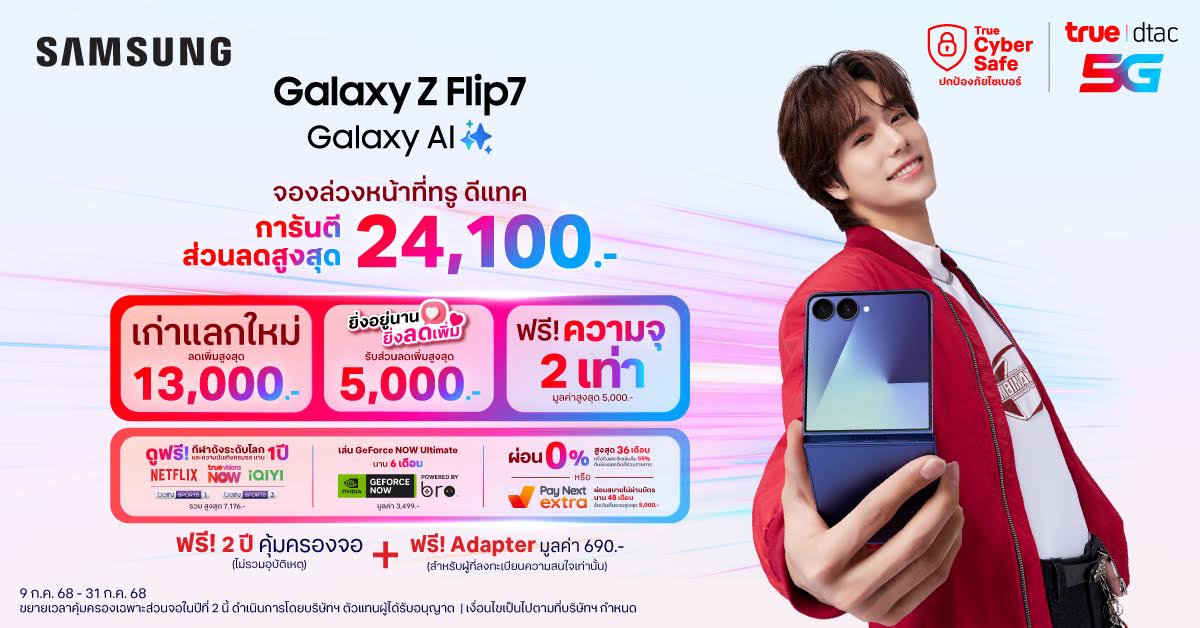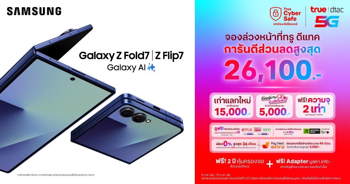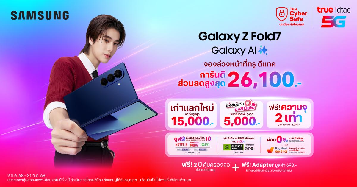 เหนือกว่าที่เคยพับ กับข้อเสนอที่คุ้มที่สุด…ทรู ดีแทค 5G เปิดจองล่วงหน้าให้เป็นเจ้าของ Samsung Galaxy Z Fold7 ดีไซน์ใหม่ เครื่อง ใหญ่แต่ “บาง” กว้าง แต่ “เบา” และ Galaxy Z Flip7 ที่มาพร้อม “จอหน้าแบบเต็มจอ” ก่อนใคร!!! สิทธิพิเศษและข้อเสนอที่ดีที่สุด รวมมูลค่า 26,100 บาท สำหรับลูกค้าทรู ดีแทค เท่านั้น เมื่อนำเครื่องเก่ามาแลกใหม่ การันตีรับส่วนลดเพิ่มสูงสุด 15,000 บาท ลูกค้าทรู ดีแทค นำอายุการใช้งานรับส่วนลดเพิ่มสูงสุด 5,000 บาท พร้อมดูฟรี ความบันเทิงครบรส Netflix, True Vision Now, iQiyi, Bein Sports1,3 นาน 1ปี มูลค่า 7,176 บาท เอาใจเกมเมอร์เล่น GeForce NOW Ultimate นาน 6 เดือน มูลค่า 3,499 บาท คุ้มครองจอฟรี 2 ปี และสิทธิพิเศษเพิ่มเติมอีกมากมาย นอกจากนี้ยังผ่อน 0% นาน 36 เดือน หรือผ่อนสบายไม่ผ่านบัตร นาน 48 เดือน กับ PAY NEXT EXTRA พร้อมรับเงินคืน รวมสูงสุด 5,000 บาท พิเศษสำหรับลูกค้าที่สั่งจองล่วงหน้า รับฟรี Adapter 25w มูลค่า 690 บาท