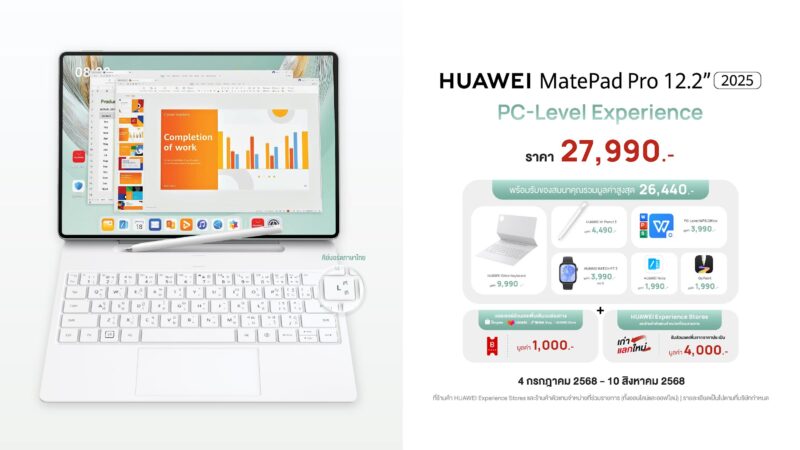 HUAWEI MatePad Pro 12.2” 2025 พร้อมเปิดให้พรีออเดอร์แล้วตั้งแต่ 4 กรกฎาคม 2568 – 10 กรกฎาคม 2568 ในราคา 27,990 บาท พร้อมของแถมมูลค่าสูงสุด 26,440 บาท ประกอบด้วย HUAWEI Glide Keyboard มูลค่า 9,990 บาท HUAWEI M-Pencil (รุ่นที่ 3) มูลค่า 4,490 บาท แอป PC-Level WPS Office มูลค่า 3,990 บาท HUAWEI WATCH FIT 3 (คละสี) มูลค่า 3,990 บาท แอป HUAWEI Notes มูลค่า 1,990 บาท แอป GoPaint มูลค่า 1,990 บาท นอกจากนี้ยังรับคูปองส่วนลดเพิ่มเติมบนช่องทางออนไลน์มูลค่า 1,000 บาท และโปรโมชันเก่าแลกใหม่ รับส่วนลดเพิ่มจากราคาประเมิน มูลค่า 4,000 บาท ที่ HUAWEI Expereince Stores และร้านค้าตัวแทนจำหน่ายที่ร่วมรายการ เป็นเจ้าของกันได้เลยที่ HUAWEI Experience Store และร้านค้าที่ร่วมรายการ รวมทั้งช่องทางออนไลน์ HUAWEI Store และร้านค้าอย่างเป็นทางการของหัวเว่ยบนแพลตฟอร์ม Lazada, Shopee และ TikTok Shop