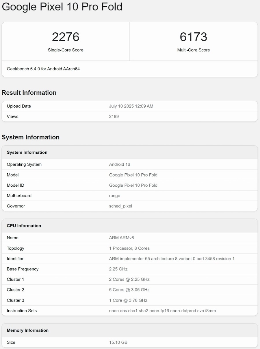 ข้อมูลจากแอป Geekbench ระบุว่า Pixel 10 Pro Fold ขับเคลื่อนด้วยชิป Tensor G5 ที่มี CPU แบบ 8-core ประกอบด้วย 2-core ความเร็ว 2.25GHz + 5-core ความเร็ว 3.05GHz + 1-core ความเร็ว 3.78GHz ความจำ RAM 16GB ทำงานบนพื้นฐานระบบปฏิบัติการ Android 16 ได้รับ 2,276 คะแนน และ 6,173 คะแนน ในการทดสอบแบบ Single-Core และ Multi-Core ตามลำดับ