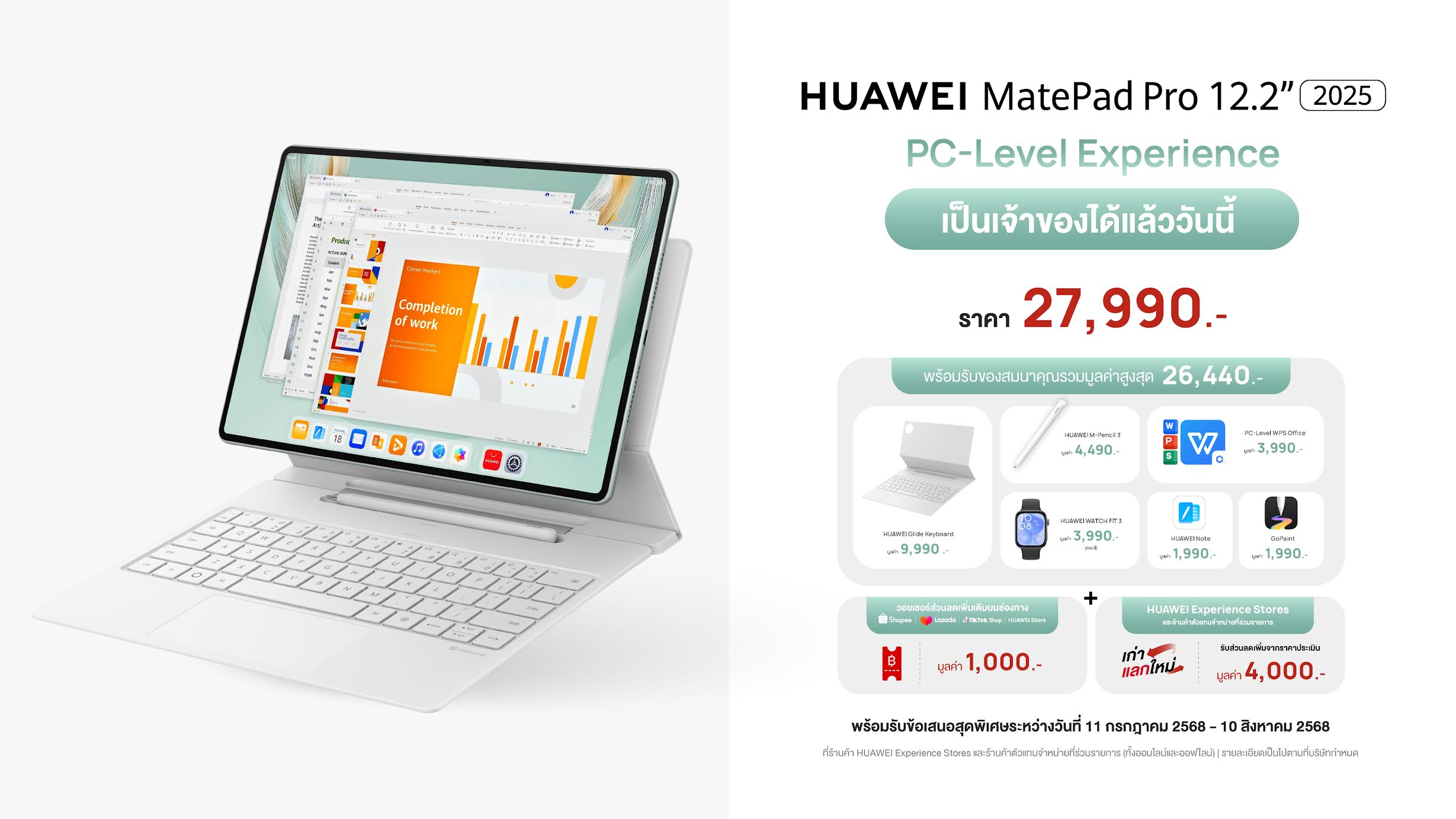 เพื่อเป็นการฉลองการวางจำหน่าย HUAWEI MatePad Pro 12.2” 2025 หัวเว่ยขอมอบข้อเสนอสุดพิเศษที่ให้คุณเป็นเจ้าของได้ง่ายขึ้น ในราคาเพียง 27,990 บาท พร้อมรับของแถมมูลค่ารวมสูงสุดถึง 26,440 บาท! ประกอบด้วย: