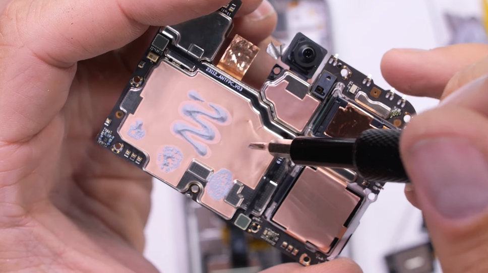 มาถึงการชำแหละเครื่อง Zack Nelson ต้องใช้ความพยายามพอสมควร เนื่องจากกระจกด้านหลังถูกยึดกับตัวเครื่องด้วยกาวอย่างแน่นหนา ขณะที่โครงสร้างภายในดูสะอาดตาด้วยดีไซน์แบบแยกส่วน และสามารถถอดแบตเตอรี่ออกได้อย่างง่ายดาย