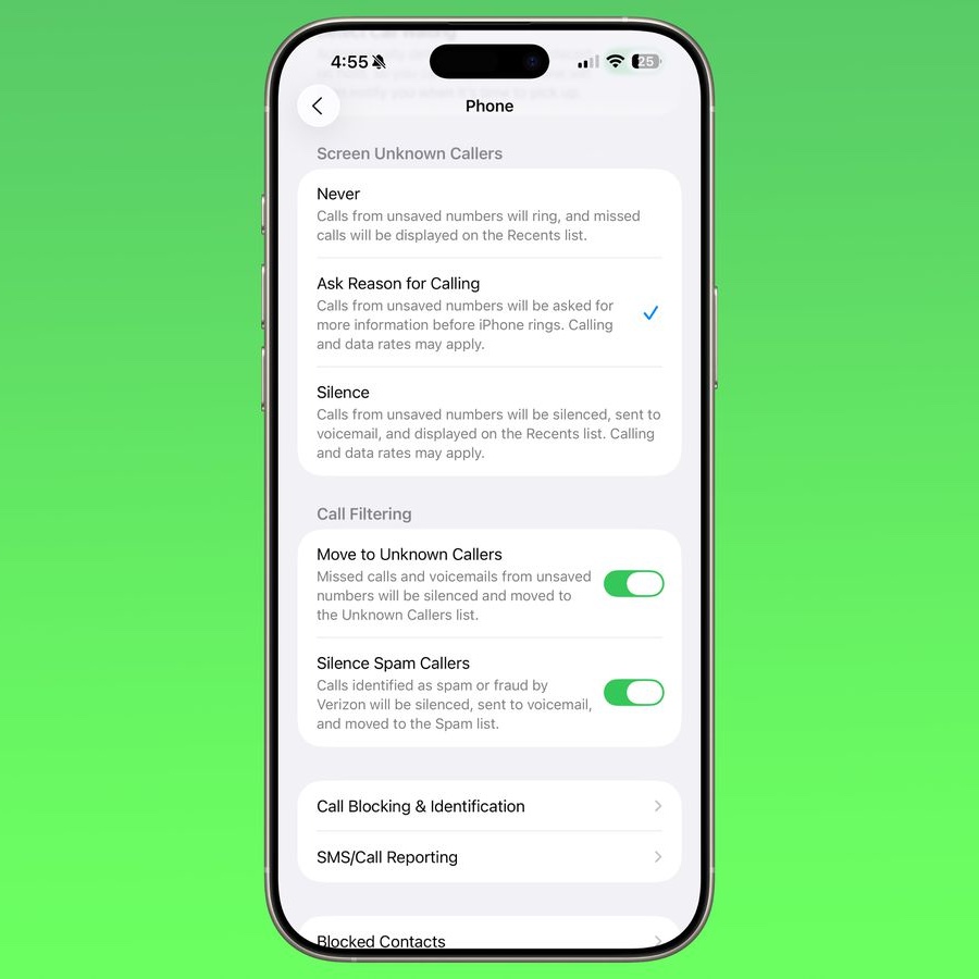 Apple เพิ่มเมนู “Screen Unknown Callers” ในแอป Phone พร้อมตัวเลือกใหม่ สำหรับปิดการใช้งาน, สอบถามเหตุผลที่โทรเข้ามาจากผู้โทรที่ไม่รู้จัก และ ปิดเสียงเตือนสายเรียกเข้าโดยอัตโนมัติ จากหมายเลขที่ไม่รู้จัก โดยจะส่งข้อมูลไปยังวอยซ์เมล