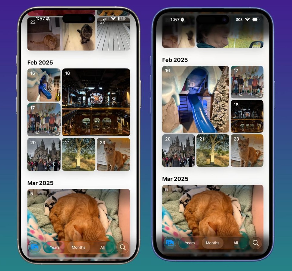 UI ใหม่ของ iOS 26 ที่เรียกว่า Liquid Glass ถูกปรับให้โปร่งใสมากขึ้น โดยเฉพาะแถบเมนูในแอปต่างๆ เช่น Photos, Music และ App Store ทำให้เห็นพื้นหลังได้มากขึ้น
