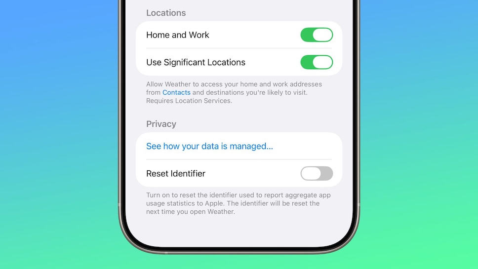 ในการตั้งค่าแอป Weather มีปุ่มเปิด/ปิดใหม่ ที่อนุญาตให้เข้าถึงสถานที่สำคัญ เมื่อเปิดใช้งานฟีเจอร์นี้ แอป Weather จะสามารถแสดงข้อมูลสภาพอากาศของสถานที่ที่ผู้ใช้งานสามารถไปเยี่ยมชมได้