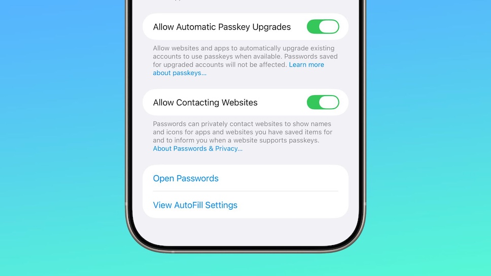 แอป Passwords มีตัวเลือก “Allow Contacting Websites” ซึ่งอนุญาตให้แอปติดต่อเว็บไซต์ เพื่อแสดงชื่อและไอคอนของแอปและเว็บไซต์ และแจ้งให้ผู้ใช้งานทราบเมื่อเว็บไซต์รองรับรหัสผ่าน