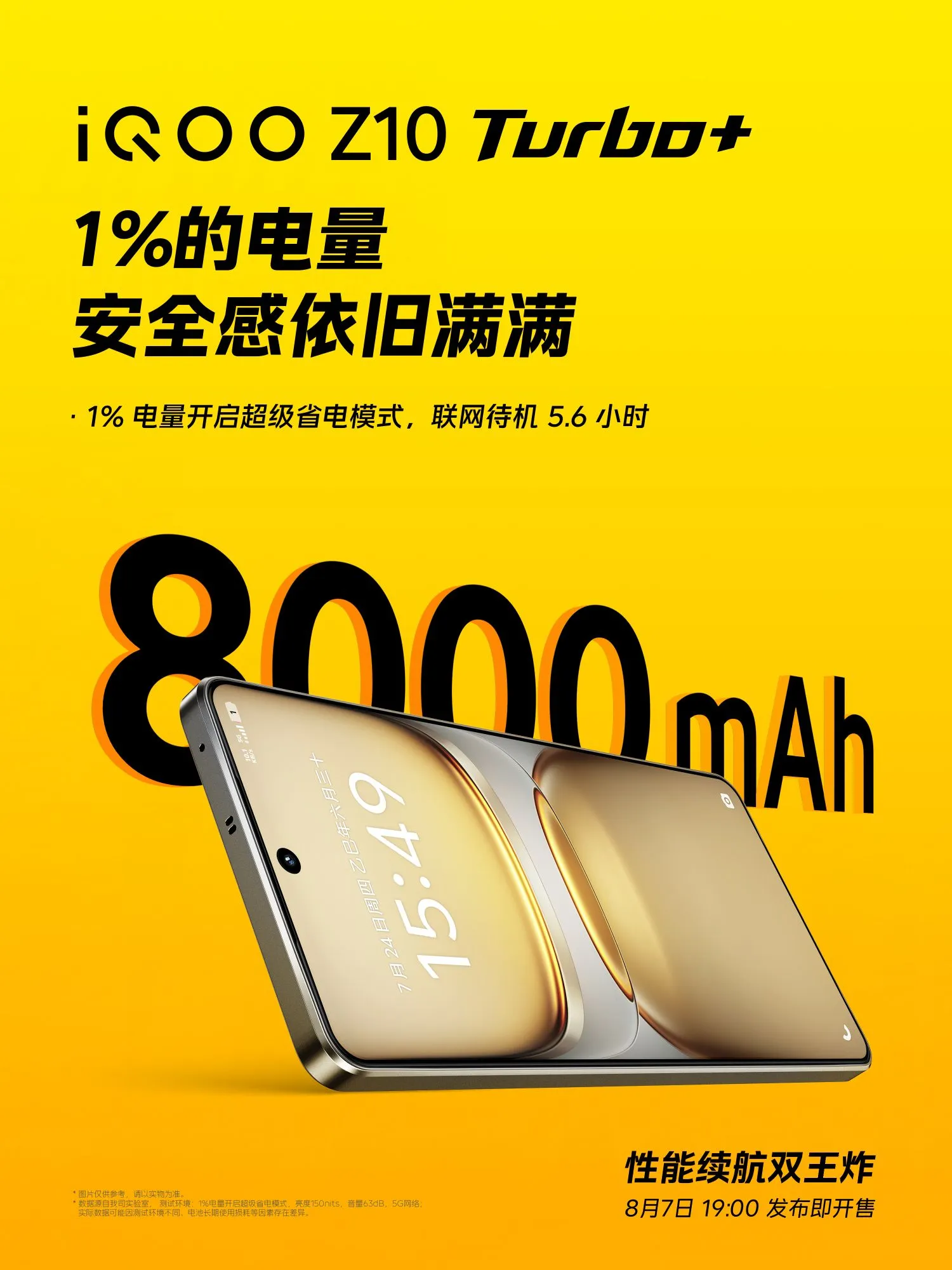 iQOO Z10 Turbo+ ชูจุดเด่นที่แบตเตอรี่ BlueVolt ความจุ 8000mAh สามารถเล่นเกม Honor of Kings ได้นานต่อเนื่องถึง 20 ชั่วโมง โดยมีตัวเครื่องบางเพียง 8.16 มิลลิเมตร และใช้ชิปประมวลผล Dimensity 9400+ ของ MediaTek