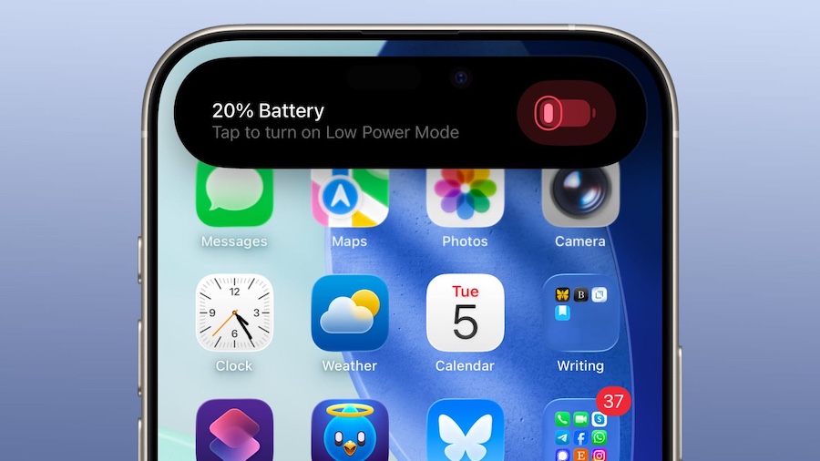 เมื่อแบตเตอรี่เหลือ 20 เปอร์เซ็นต์ จะมีการแจ้งเตือนบน Dynamic Island