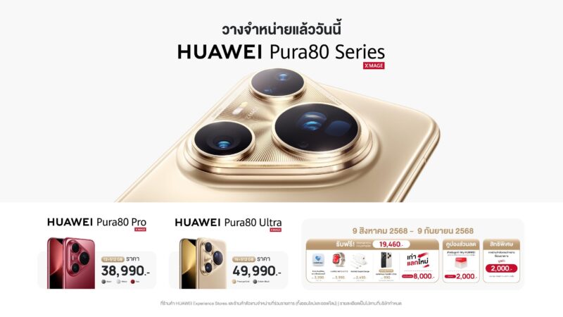 HUAWEI Pura 80 Series พร้อมให้คุณเป็นเจ้าของแล้ววันนี้ โดย HUAWEI Pura 80 Pro วางจำหน่ายใน 3 สี ได้แก่ สีดำ สีขาว และสีแดง (เป็นครั้งแรกในรุ่น Pro) ในราคาเพียง 38,990 บาท ส่วน HUAWEI Pura 80 Ultra มีให้เลือก 2 สี ได้แก่ สีทอง และสีดำ ในราคาเพียง 49,990 บาท พิเศษเมื่อซื้อระหว่างวันที่ 9 สิงหาคม – 9 กันยายน 2568 รับของสมนาคุณมูลค่ารวมสูงสุดกว่า 19,460 บาท ฟรีทันที เช่น HUAWEI Care มูลค่า 3,990 บาท HUAWEI WATCH FIT 3 มูลค่า 3,990 บาท HUAWEI SuperCharge มูลค่า 2,490 บาท และเคสมือถือรุ่น HUAWEI Pura 80 Ultra มูลค่า 990 บาท* (เฉพาะรุ่น Ultra) พร้อมโปรโมชั่นเก่าแลกใหม่ ลดเพิ่มสูงสุด 8,000 บาท ที่ HUAWEI Experience Store และร้านค้าที่ร่วมรายการทั้งออฟไลน์และออนไลน์ รวมถึง HUAWEI Store และร้านค้าอย่างเป็นทางการของหัวเว่ยบนแพลตฟอร์ม Lazada, Shopee และ TikTok Shop นอกจากนี้ยังเพิ่มความพิเศษสำหรับลูกค้า My HUAWEI รับคูปองส่วนลดมูลค่า 2,000 บาท และสิทธิพิเศษจากร้านค้าตัวแทนที่ร่วมรายการมูลค่า 2,000 บาท (เฉพาะรุ่น Pro) และผู้ใช้ HUAWEI Pura 80 Series ยังเพลิดเพลินกับสิทธิประโยชน์สุดพิเศษจากแอปพันธมิตร ได้แก่ รับบริการคลาวด์ 200GB ต่อเดือน ฟรีเดือนแรก และสมาชิก HUAWEI Video x Mango TV VIP ฟรีเดือนแรก
