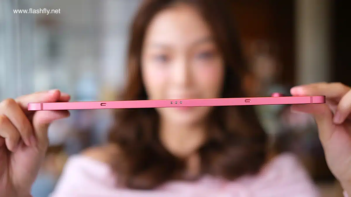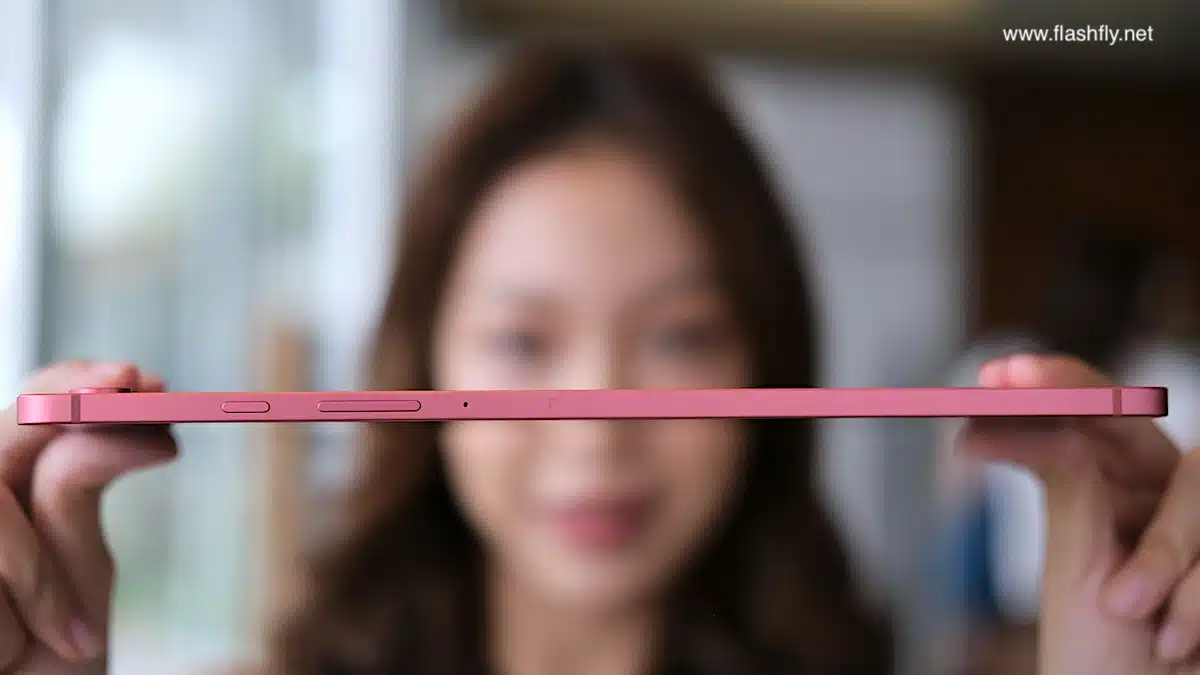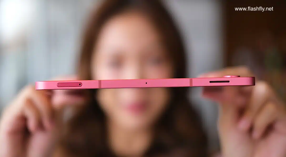 ขอบด้านข้างมีความบาง 6.6 มิลลิเมตร พบช่องลำโพง ไมโครโฟน และ ถาดใส่ซิมการ์ด กับ MicroSD