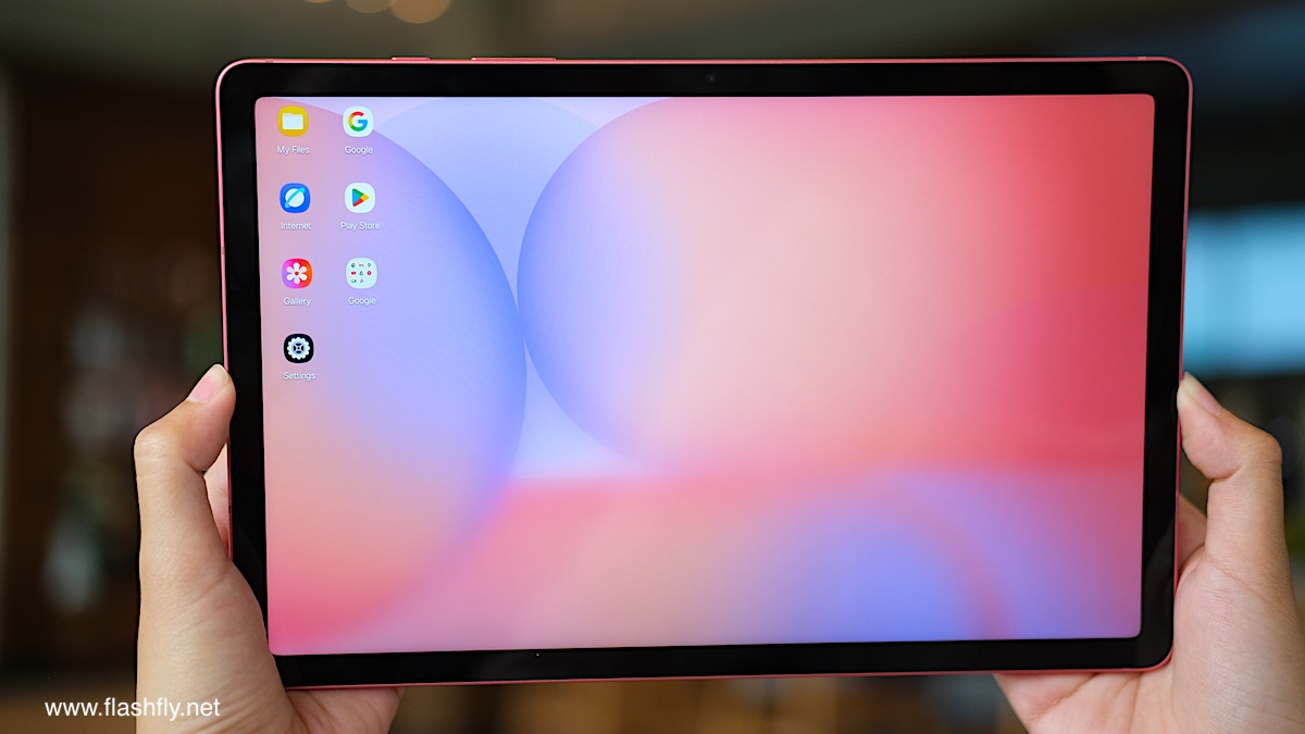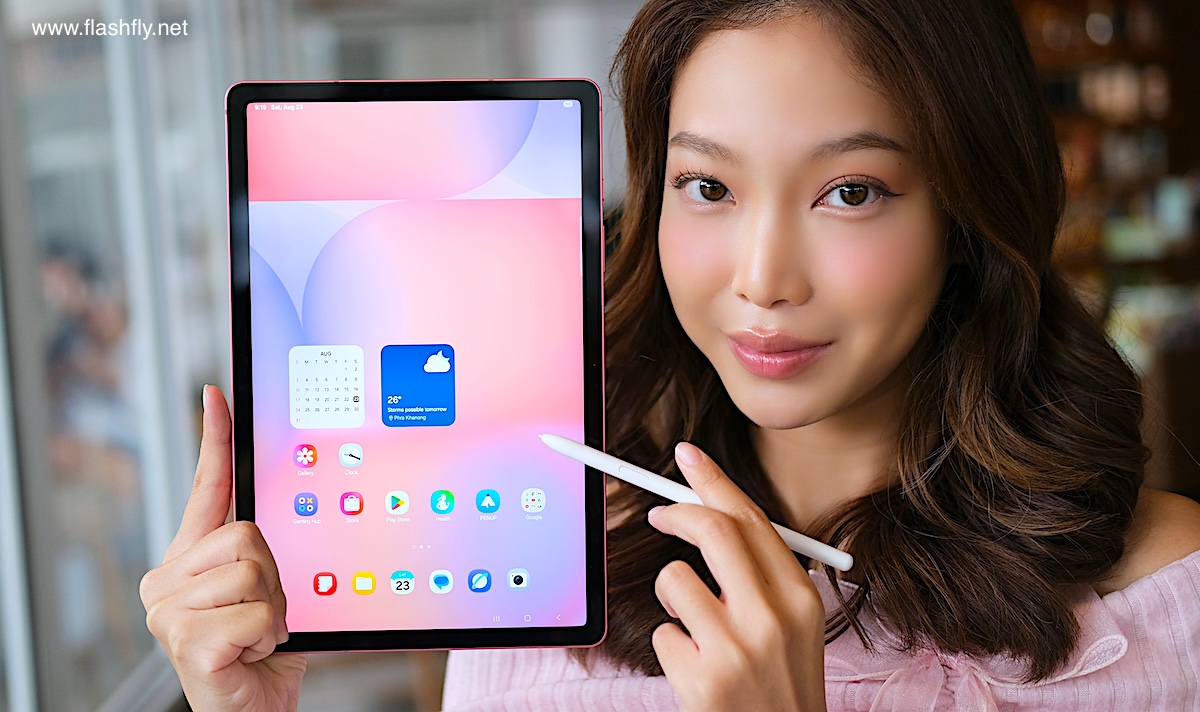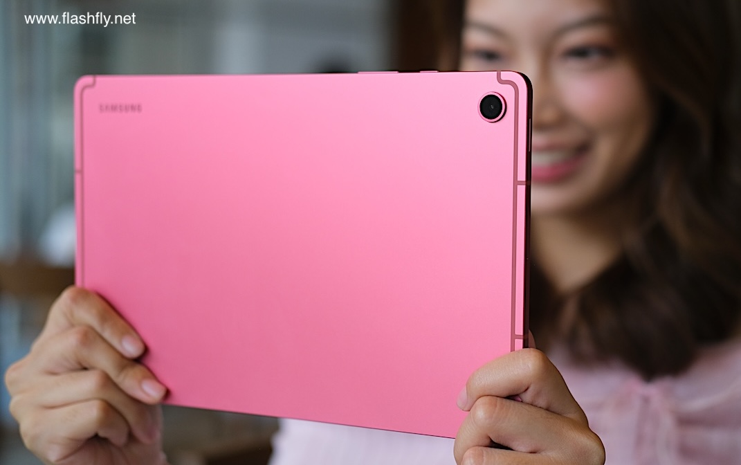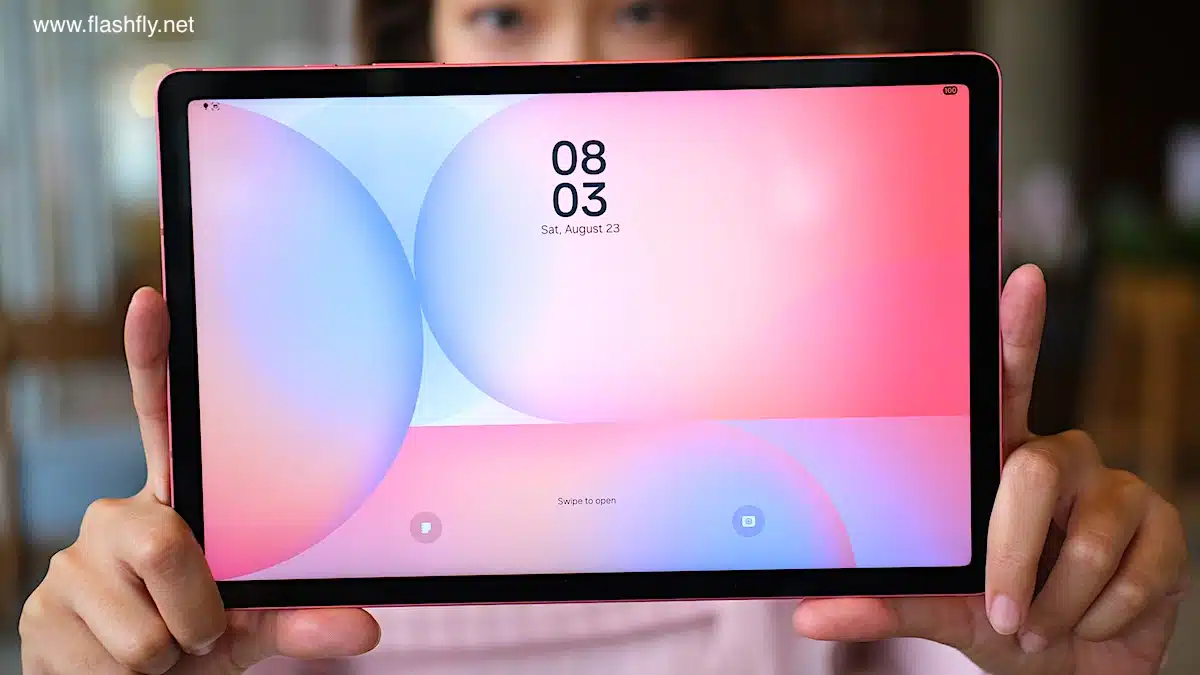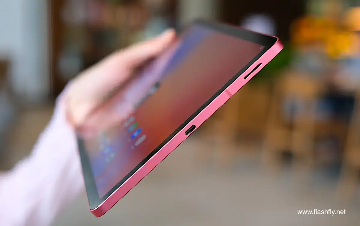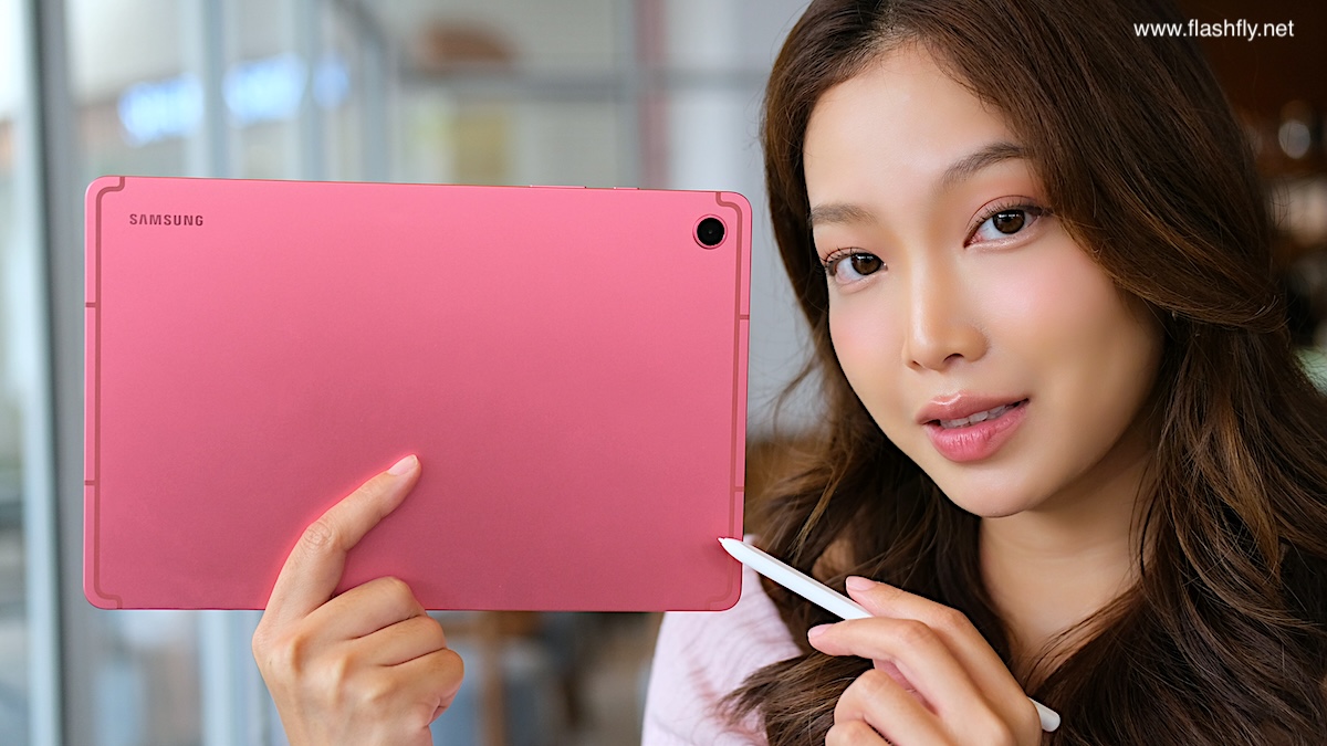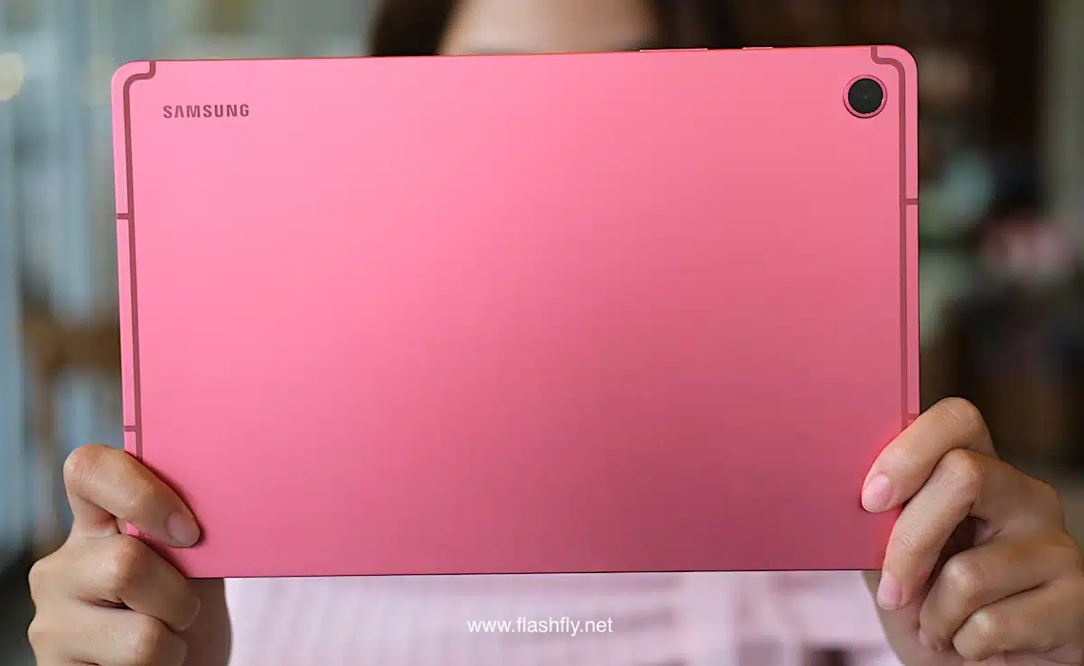 Samsung Galaxy Tab S10 Lite ผลิตออกมาให้เลือก 2 สี โดยทีมงาน @flashfly ได้รับสี Coral Red สีเดียวกับ Galaxy Flip 7 มารีวิว เป็นโทนสีแดงที่ให้ความสดใส และยังมีสีเทาเป็นอีกทางเลือก แต่ไม่ว่าจะเลือกสีไหน ก็สัมผัสได้ถึงงานประกอบที่พรีเมียม ด้วยวัสดุอะลูมิเนียมคุณภาพสูง กรอบตัวเครื่องบางเพียง 6.6 มิลลิเมตร น้ำหนักเบา 524 กรัม ทำให้พกพาไปใช้งานนอกสถานที่ได้อย่างคล่องตัว