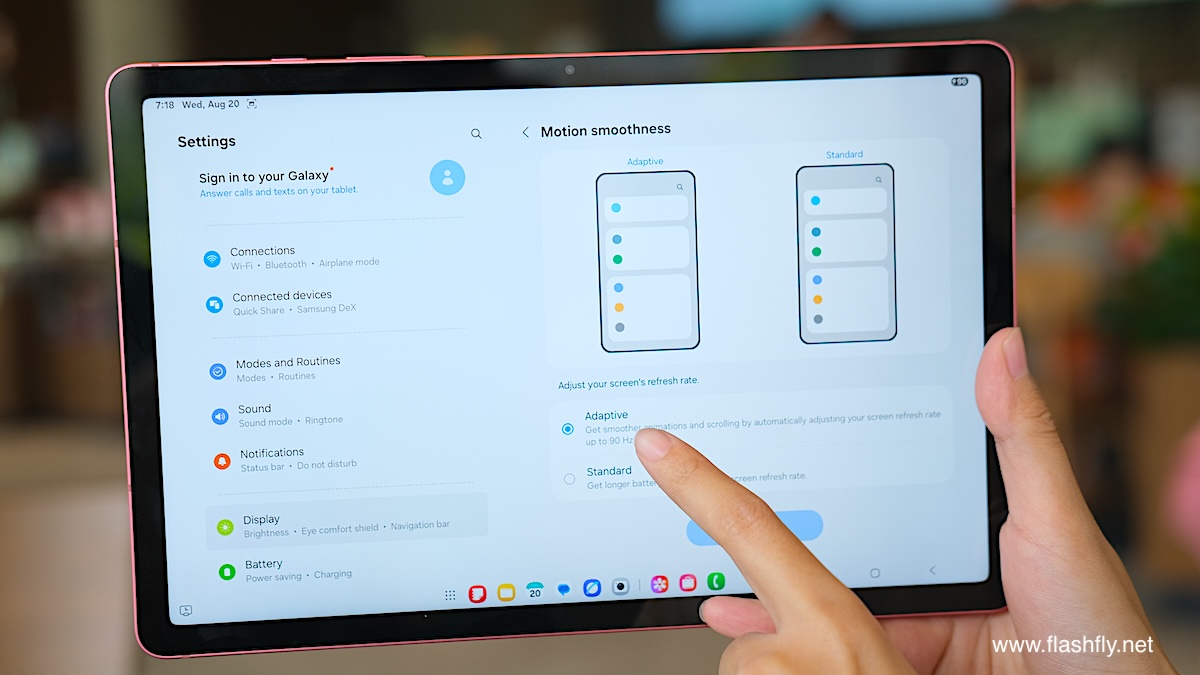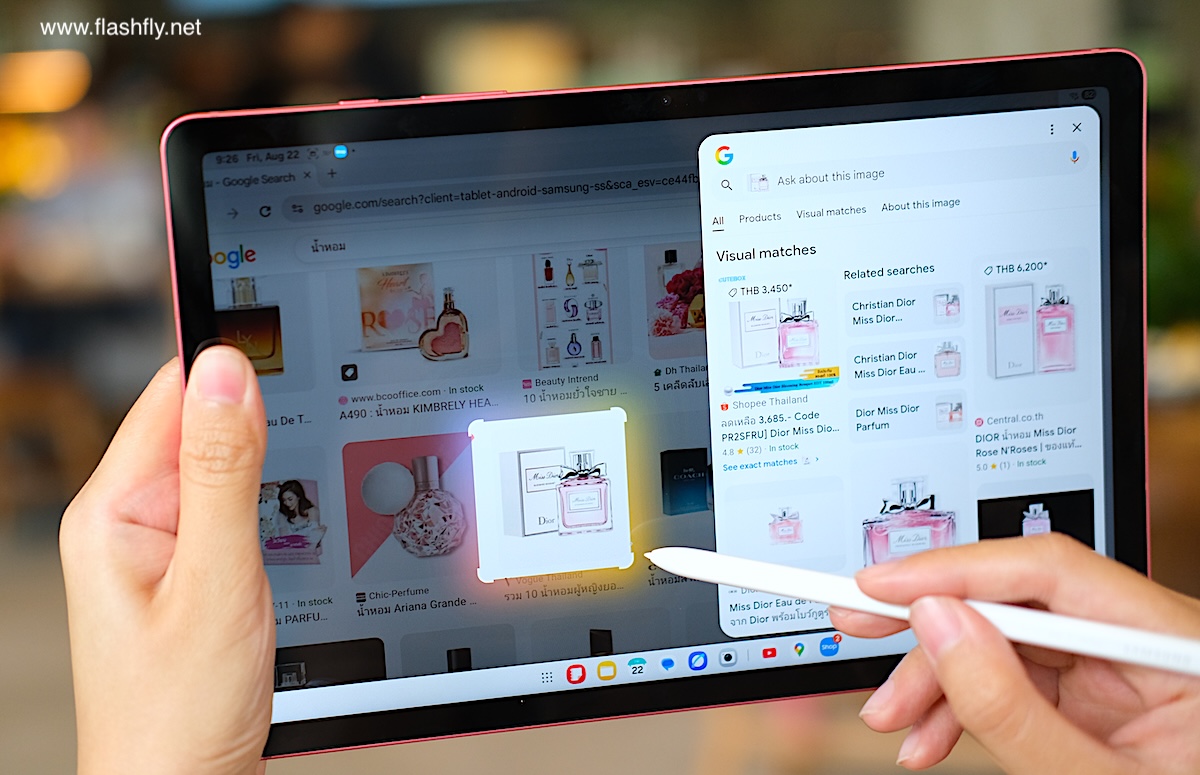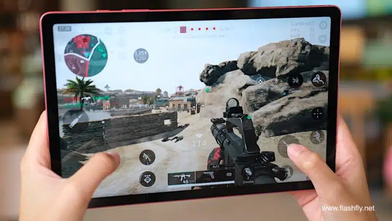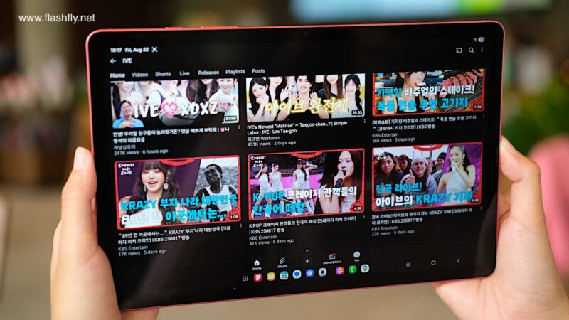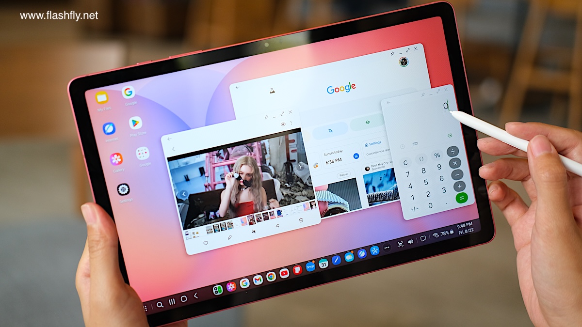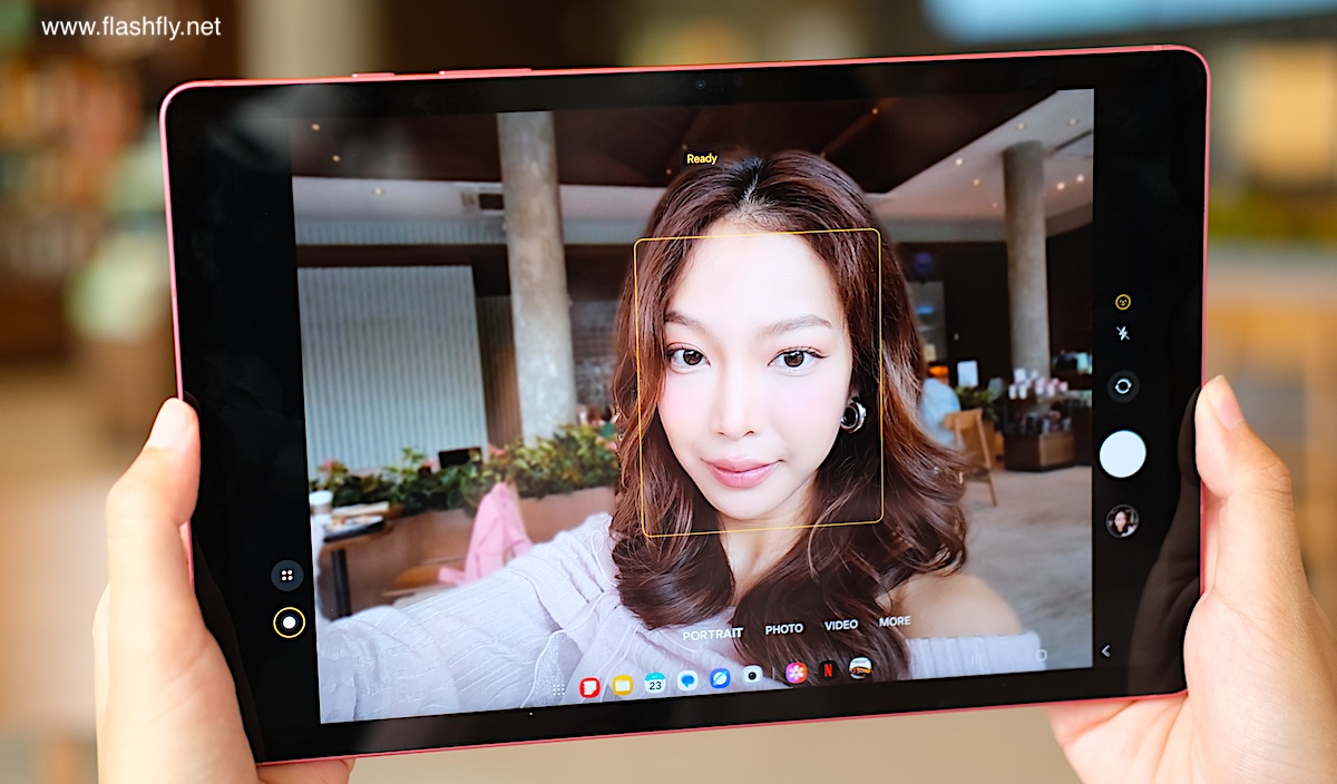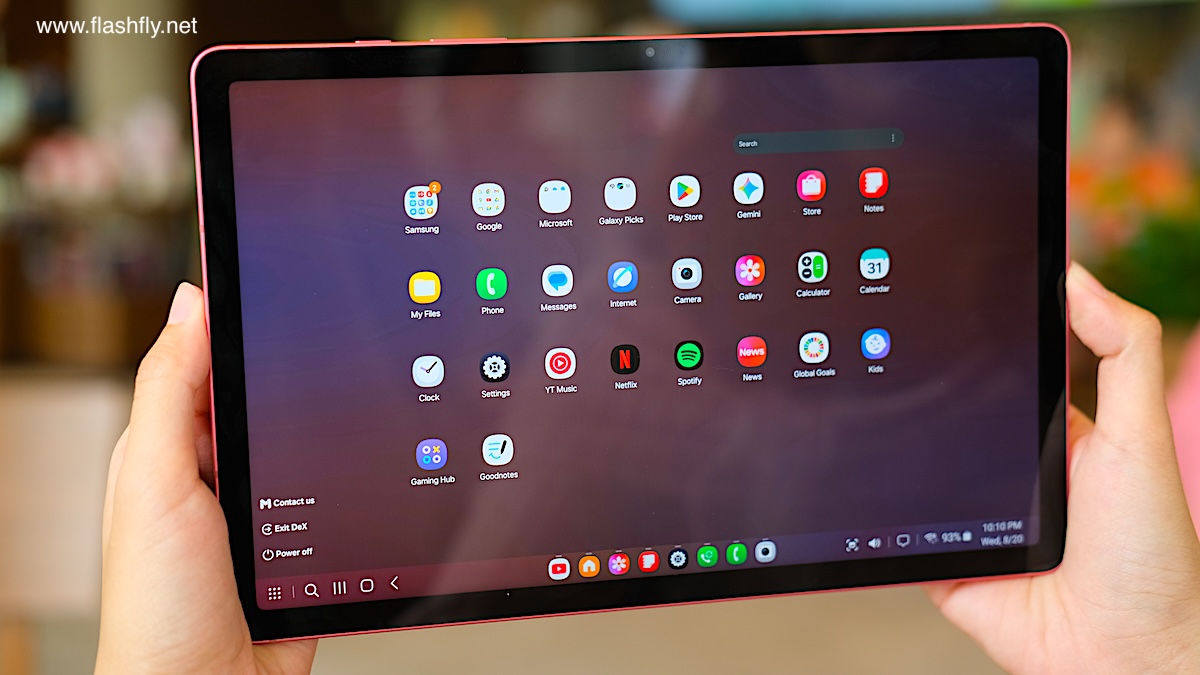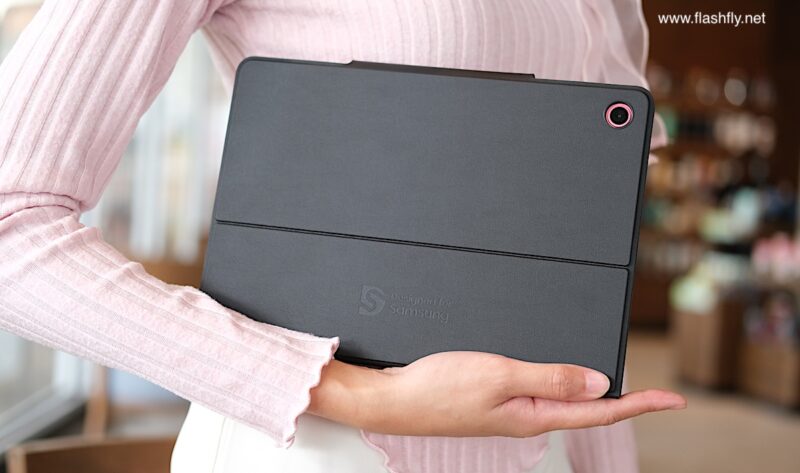Samsung Galaxy Tab S10 Lite ผลิตออกมาให้เลือก 2 สี โดยทีมงาน @flashfly ได้รับสี Coral Red สีเดียวกับ Galaxy Flip 7 มารีวิว เป็นโทนสีแดงที่ให้ความสดใส และยังมีสีเทาเป็นอีกทางเลือก แต่ไม่ว่าจะเลือกสีไหน ก็สัมผัสได้ถึงงานประกอบที่พรีเมียม ด้วยวัสดุอะลูมิเนียมคุณภาพสูง กรอบตัวเครื่องบางเพียง 6.6 มิลลิเมตร น้ำหนักเบา 524 กรัม ทำให้พกพาไปใช้งานนอกสถานที่ได้อย่างคล่องตัว