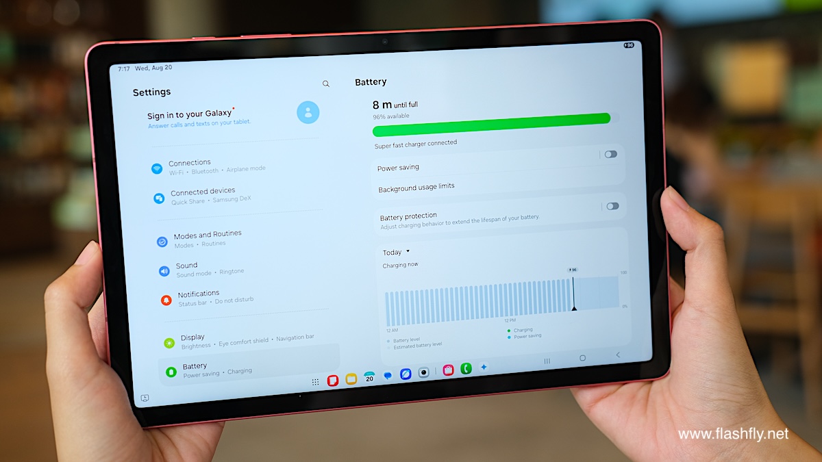 แบตเตอรี่ก็มีความจุเพิ่มขึ้นเป็น 8,000mAh จาก 7,040mAh (เมื่อเทียบกับ Galaxy Tab S6 Lite LTE 2024) และยังชาร์จไวขึ้นเป็น 25W จาก 15W ทำให้ Galaxy Tab S10 Lite ทีมีอายุการใช้งานสามารถสตรีมวีดีโอได้นานสูงสุด 10 ชม. และยังชาร์จแบตเตอรี่ให้เต็มได้เร็วกว่าเดิมด้วย