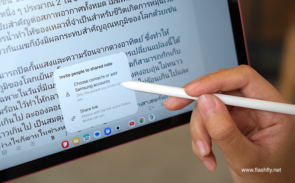 นอกจากนี้ แอป Samsung Notes ยังมาพร้อมฟีเจอร์ Invite Collaborator สามารถทำงานร่วมกันเป็นทีม รองรับการแก้ไขไฟล์ Notes พร้อมกันหลายๆ คน และมีฟีเจอร์ Laser Pointer ช่วยให้งานนำเสนอเป็นเรื่องง่าย อีกทั้งยังสามารถเชื่อมต่อกับบัญชี Samsung Account หรือ OneNote ได้ เพื่อทำงานแบบข้ามแพลตฟอร์ม สามารถเปิดโน้ตจากมือถือหรือ PC และทำงานต่อได้ทันที