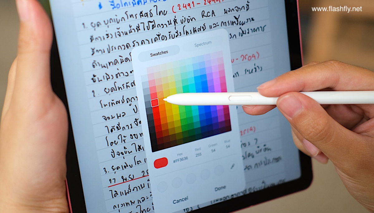 นอกจากการจดบันทึก Samsung Notes ยังรองรับการแนบรูปภาพ รูปวาด หรือใส่ตารางได้ และมีสีให้เลือกได้ไม่จำกัด หากมีสีเฉพาะที่ต้องการใช้ สามารถใช้เครื่องมือ “Eyedropper” เพื่อเลือกสีจากวัตถุอื่นบนหน้าจอแล้วนำมาใช้กับข้อความหรือวัตถุในแอป Samsung Notes ได้