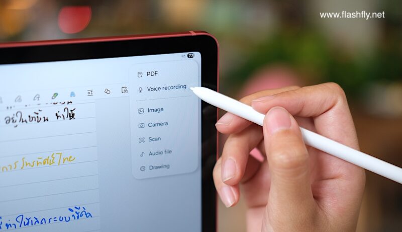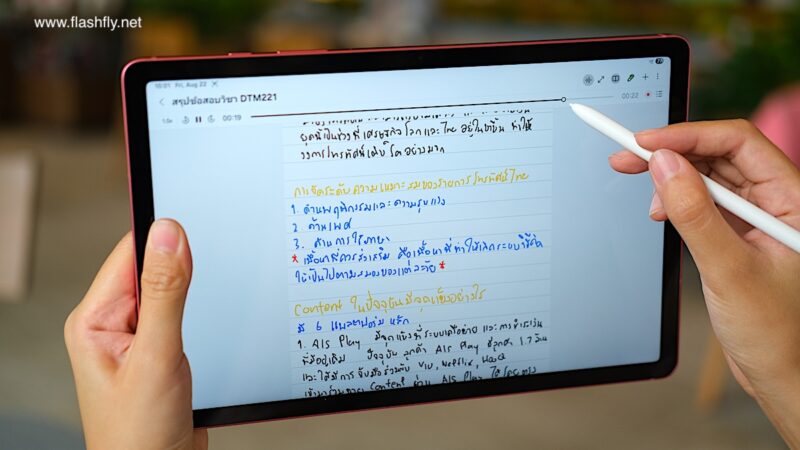 อีกจุดเด่นของ Samsung Notes คือสามารถจดโน้ตพร้อมบันทึกเสียงไปพร้อมกัน เหมาะสำหรับการจดโน้ตในที่ประชุม จดเลคเชอร์ จดบทสัมภาษณ์ หรือโน้ตระหว่างวีดีโอคอล สามารถฟังเสียงย้อนหลังโดยเลือกจากจุดที่เขียนตอนนั้นได้เลย ไม่ต้องฟังทั้งหมดแต่แรก