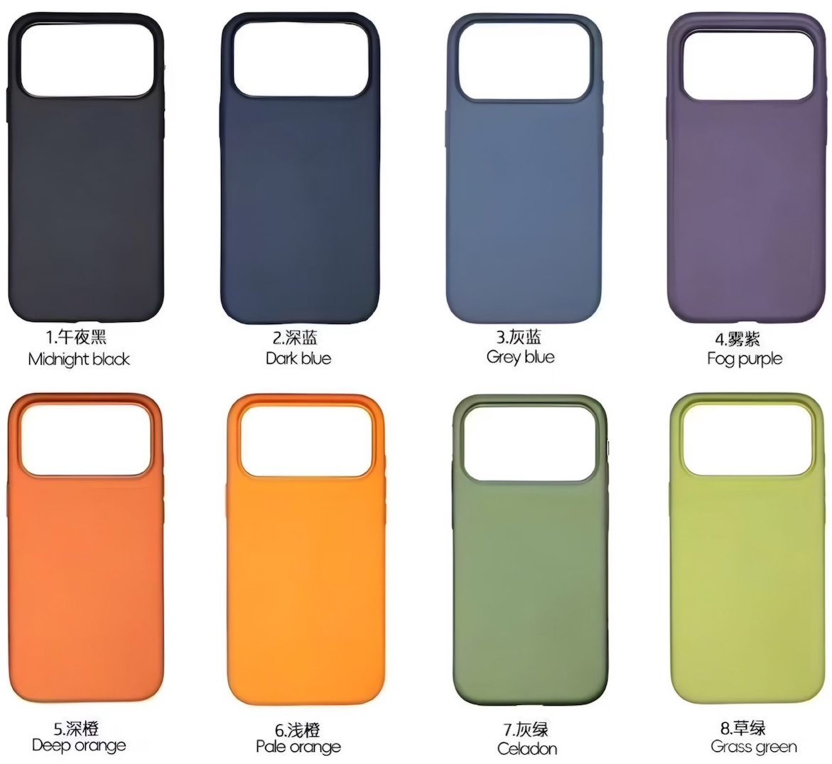 เคส Liquid Silicone สำหรับ iPhone 17 ให้สัมผัสนุ่มมือ พื้นผิวด้าน มีให้เลือกทั้งหมด 8 สี ได้แก่ สีส้มเข้ม, สีส้มอ่อน, สีเขียวอ่อน, สีเขียวเข้ม, สีม่วง, สีน้ำเงินเทา, สีน้ำเงินเข้ม และ สีดำ นอกจากนี้ Apple ยังมีโอกาสเปิดตัวสีใหม่ๆ เพิ่มเติมในอนาคต