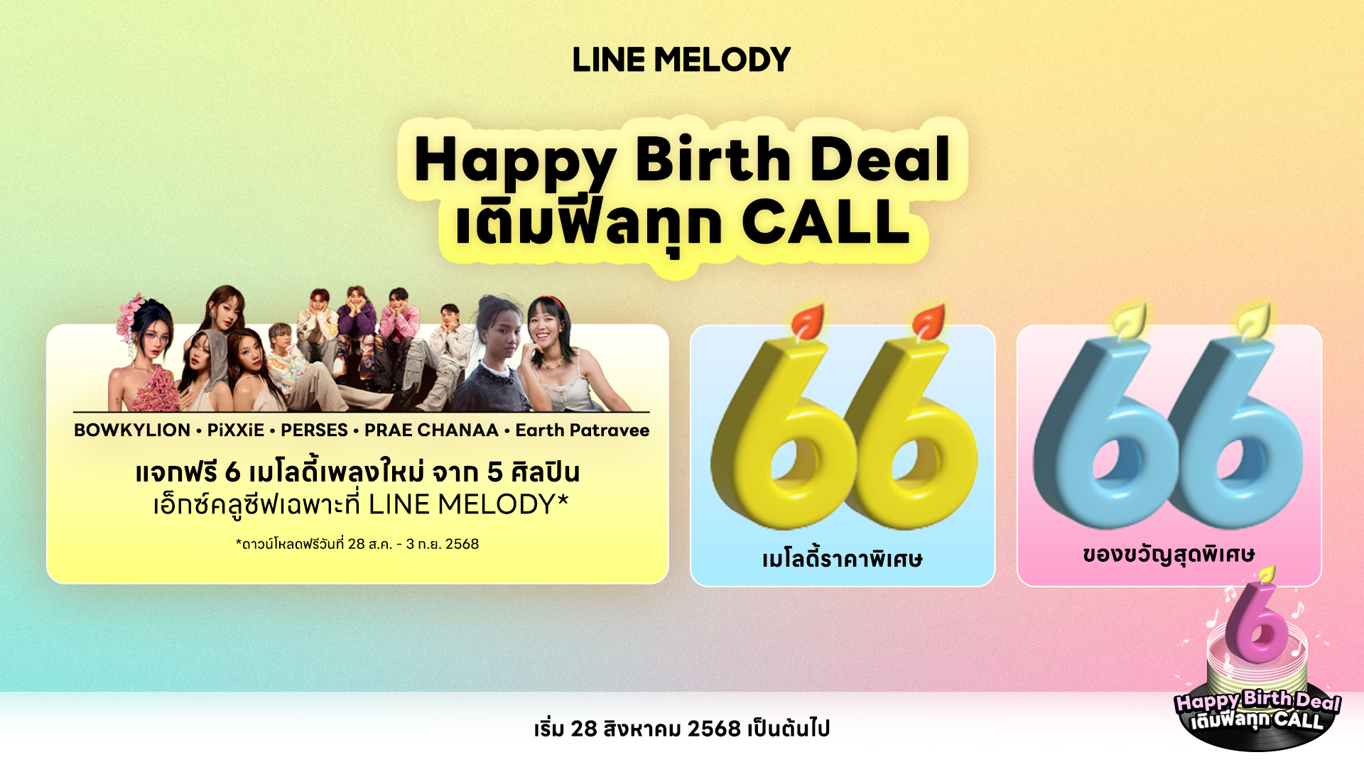 LINE MELODY บริการเสียงเรียกเข้าและเสียงรอสายบนแพลตฟอร์ม LINE เดินหน้าฉลองครบรอบ 6 ปี ส่งแคมเปญ “HAPPY BIRTH DEAL เติมฟีลทุก CALL” เอาใจแฟนเพลงทั่วประเทศ ตอกย้ำบทบาทการเป็นกำลังสำคัญในการสนับสนุนและยกระดับอุตสาหกรรมเพลงไทยตลอดระยะเวลา 6 ปีที่ผ่านมา สะท้อนถึงพลังการเติบโตอย่างมั่นคงและความไว้วางใจจากผู้ใช้ทั่วประเทศ