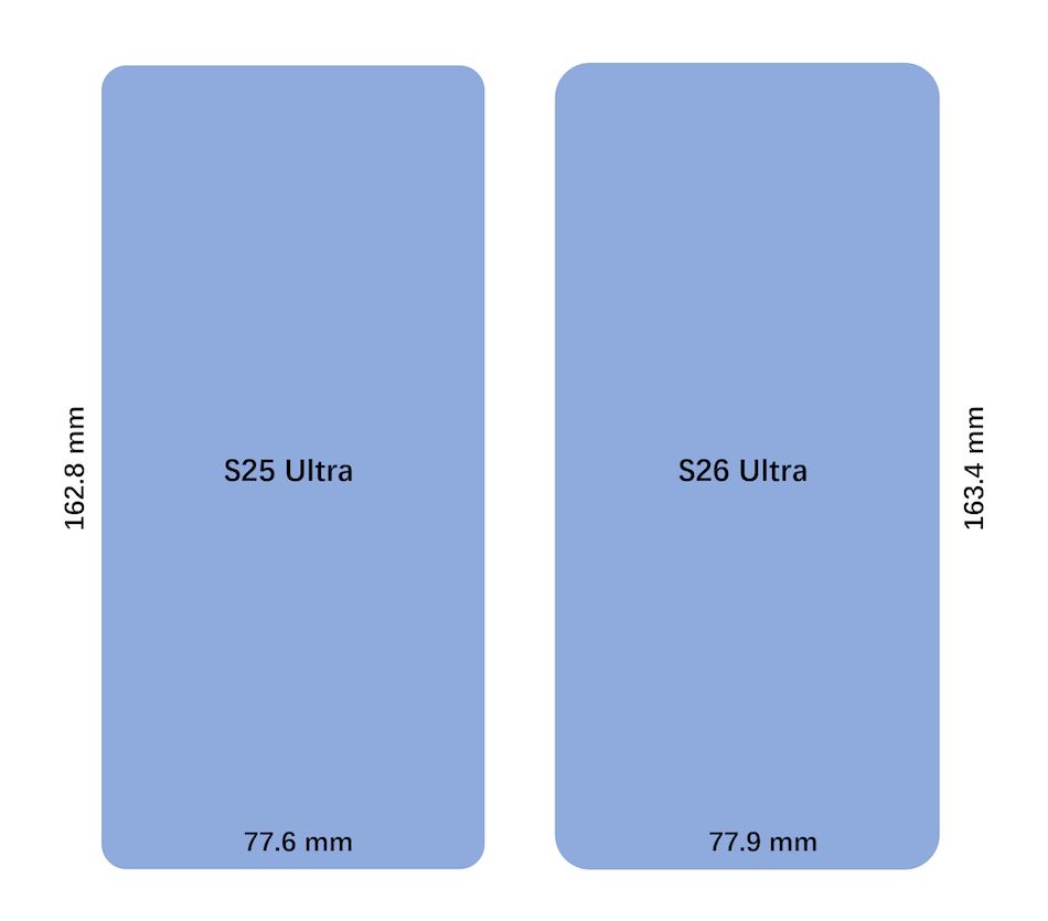 นอกจากนี้ Ice Universe ยังพบว่า Galaxy S26 Ultra จะมีความกว้างและความสูง เพิ่มขึ้นเล็กน้อย เมื่อเทียบกับ Galaxy S25 Ultra
