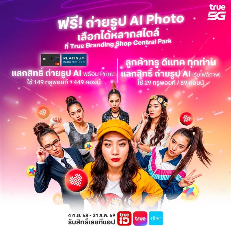 พิเศษ เพื่อเป็นการเฉลิมฉลองการเปิดตัวอย่างเป็นทางการของ “True Branding Shop” และ “TrueSphere” ณ Dusit Central Park ทรูพร้อมมอบสิทธิพิเศษที่คัดสรรมาให้กับลูกค้าใด้สัมผัสความสร้างสรรค์ในแบบคุณกับ “Generative AI Snap Photo” ถ่ายภาพครีเอทีฟ 4 แอ็กชัน สำหรับลูกค้าทรูและดีแทค แลกเพียง 29 ทรูพอยท์ หรือ 89 ดีแทคคอยน์ รวมถึงเป็นเจ้าของ Pocketalk S Plus อุปกรณ์ล่ามอัจฉริยะดีไซน์พรีเมียม ในราคาพิเศษเพียง 9,500 บาท (จากปกติ 9,900 บาท) ตั้งแต่วันนี้ – 30 กันยายน 2568