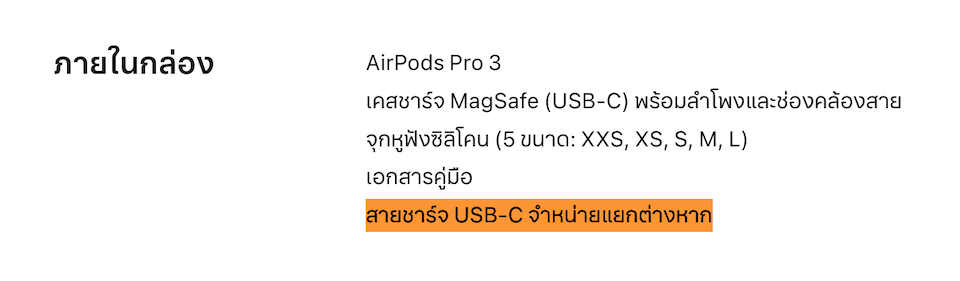 ข่าวร้ายก็คือ AirPods Pro 3 ไม่มีสายชาร์จมาให้ในกล่องแล้ว โดยภายในกล่องจะพบกับ AirPods Pro 3, เคสชาร์จ MagSafe (USB-C), จุกหูฟังซิลิโคน (5 ขนาด) และ คู่มือ