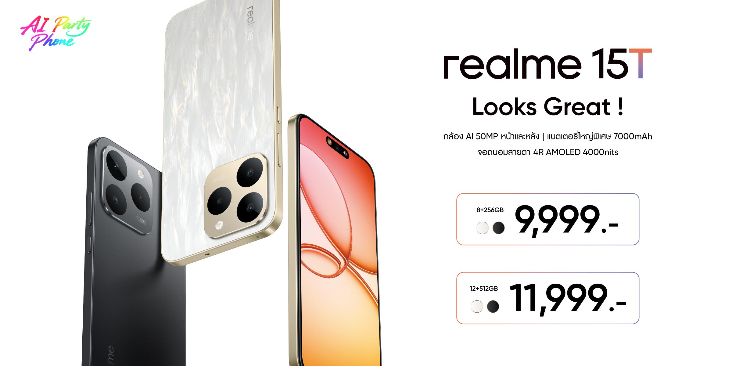 - realme 15T เลือกได้ทั้งสี Flowing Silver และ Suit Titanium สเปก 8GB/256GB ราคา 9,999 บาท และ 12GB/512GB ในราคา 11,999 บาท