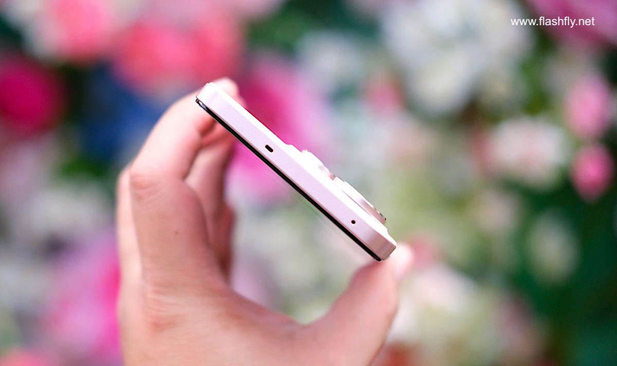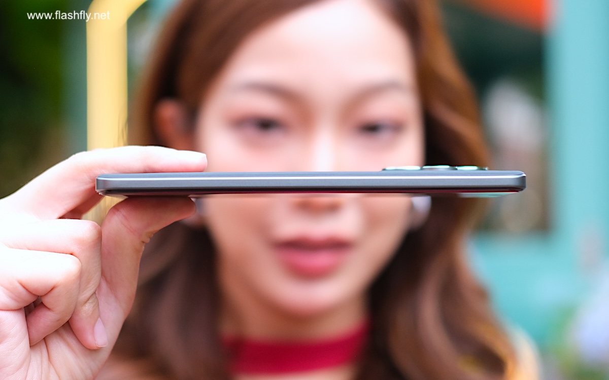 ส่วนขอบด้านข้างมีดีไซน์เรียบแบน บางเพียง 7.66 มิลลิเมตร ซึ่งถือว่าบางเป็นพิเศษ เมื่อเทียบกับขนาดแบตเตอรี่ที่มีความจุสูงถึง 7000mAh