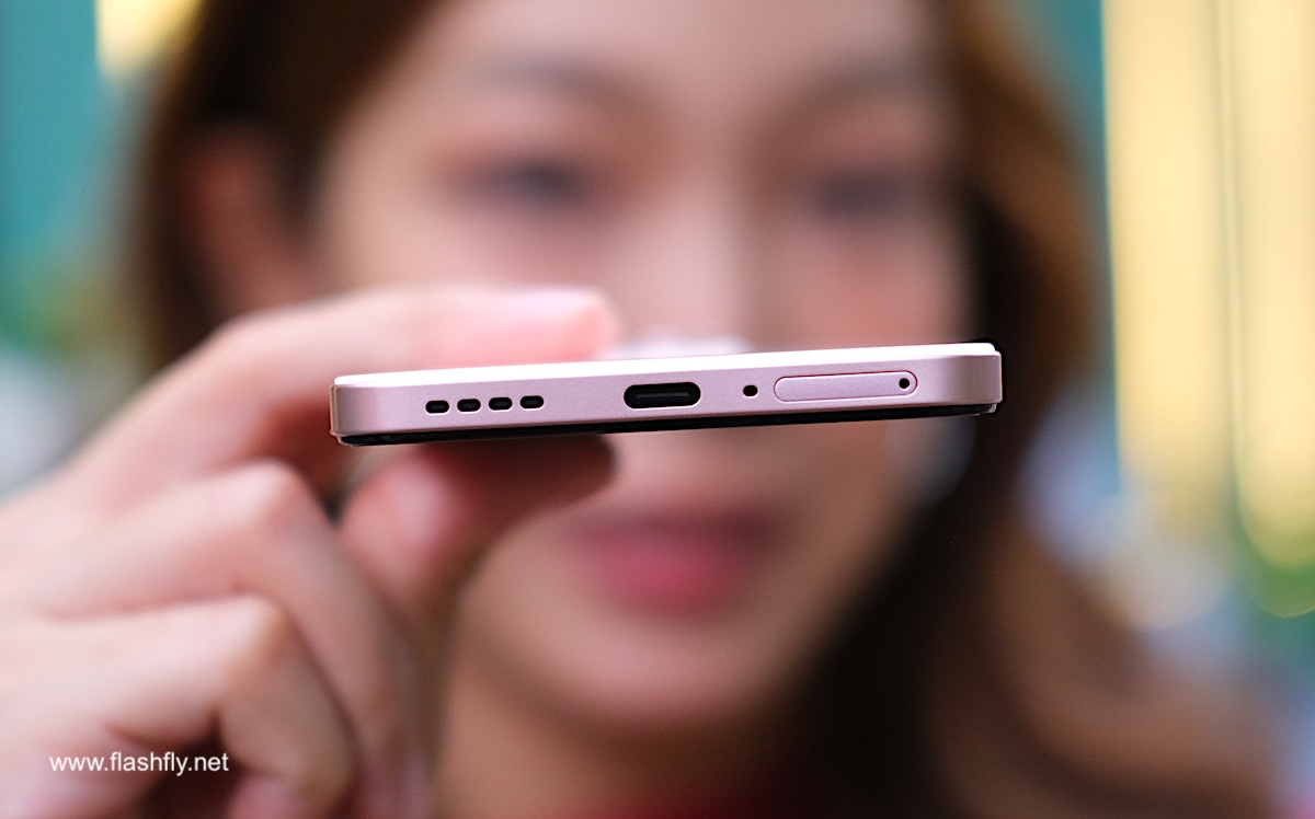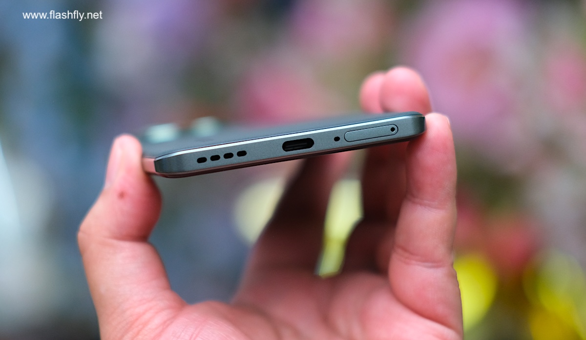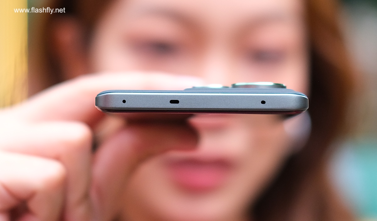 ด้านล่างประกอบด้วย ลำโพงตัวหลัก, พอร์ตเชื่อมต่อ USB-C, ไมโครโฟนตัว และ ถาดใส่ซิมการ์ด รองรับ 2 ซิม Dual Nano SIM (5G + 5G)