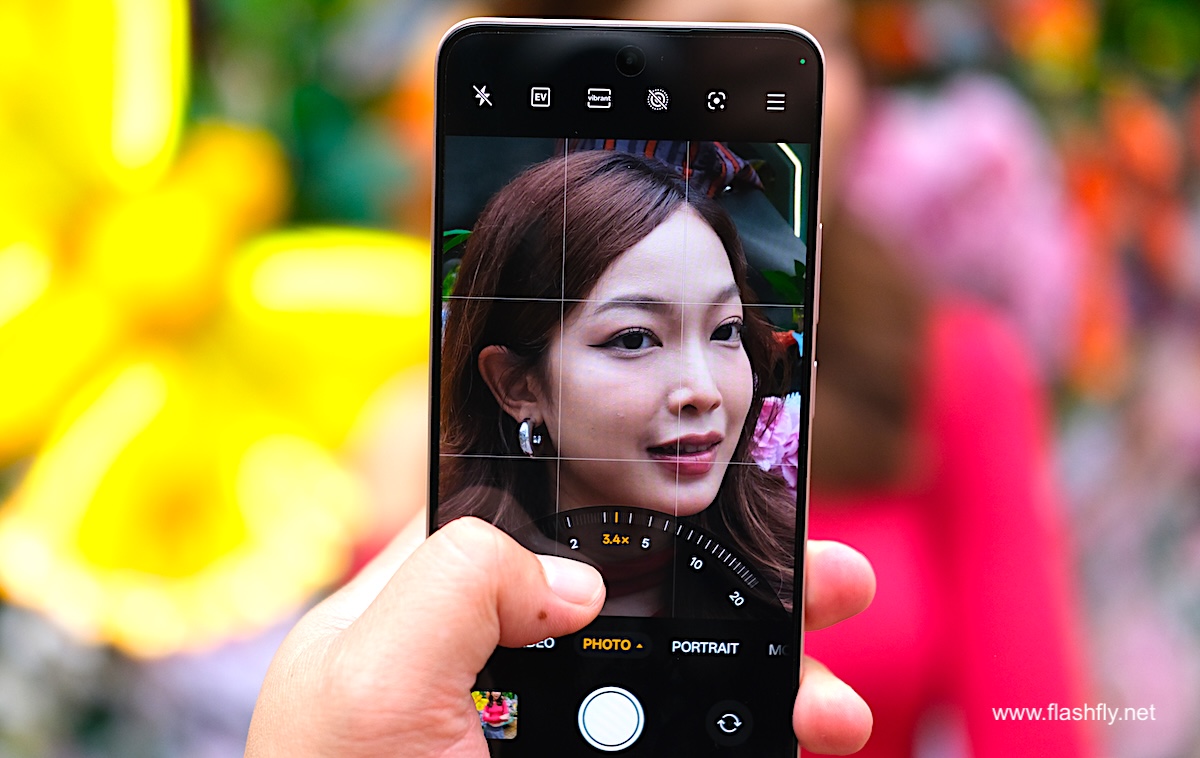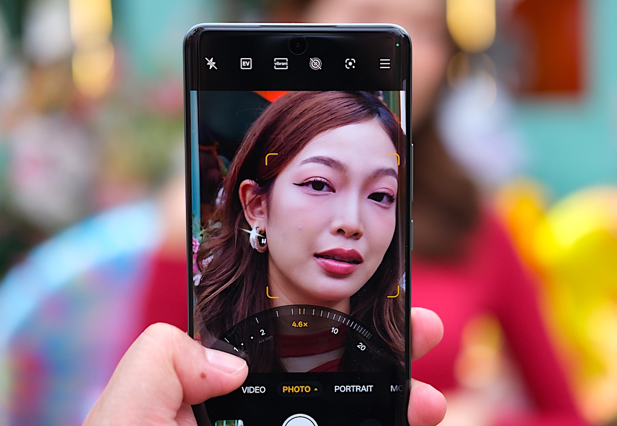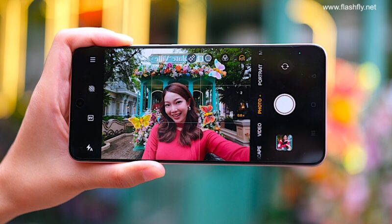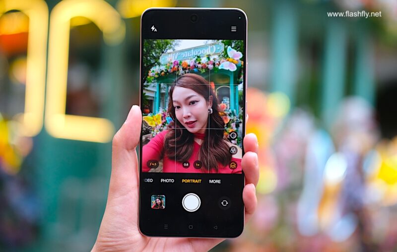 โหมด Portrait สามารถซูมได้ที่ระยะ 1x, 2x รองรับฟีเจอร์ Soft Light, Filters, Retouch แบบเดียวกับโหมด Photo และสามารถปรับค่า F เพื่อละลายฉากหลังได้ในช่วง F1.4 ถึง F16 ส่วนแถบเครื่องมือด้านบน สามารถปรับความสว่างและอุณหูมิสีโทนอุ่นของไฟแฟลชได้