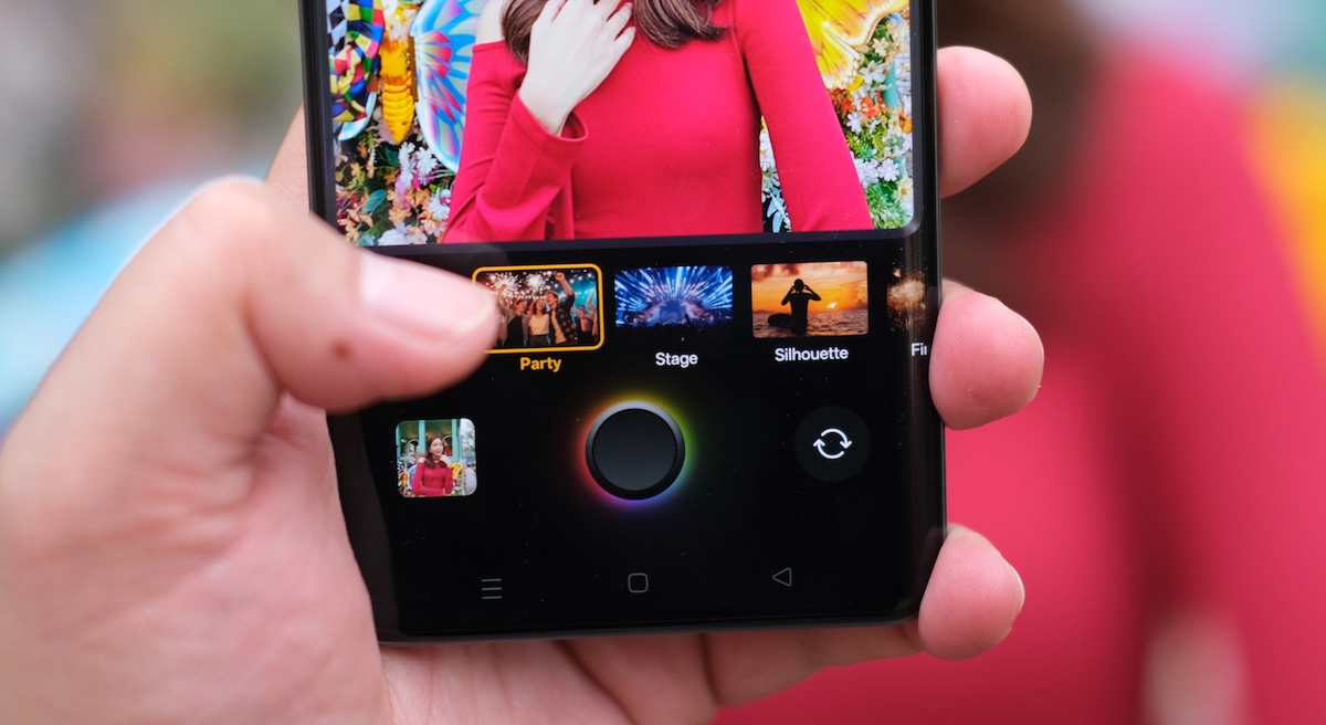 เมื่อแตะที่ชื่อโหมด Photo จะพบกับฟีเจอร์ Smart Scenes ช่วยปรับค่ากล้องตามฉากที่ต้องการถ่าย ได้แก่ Party, Stage, Silhouette, Firework แถบเครื่องมือด้านบนของโหมด Photo มีฟีเจอร์ปรับค่าชดเชยแสงในช่วง -2.0 ถึง +2.0 ข้างกันเป็นฟิลเตอร์สี (Vibrant และ Crisp) ตามด้วยโหมดถ่ายภาพ Livephoto ซึ่งรองรับความละเอียด 2K และแชร์ไปยัง IG Story ได้