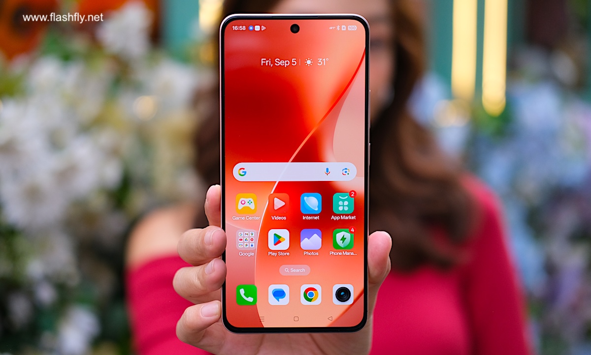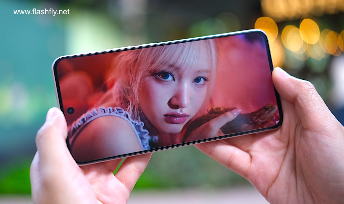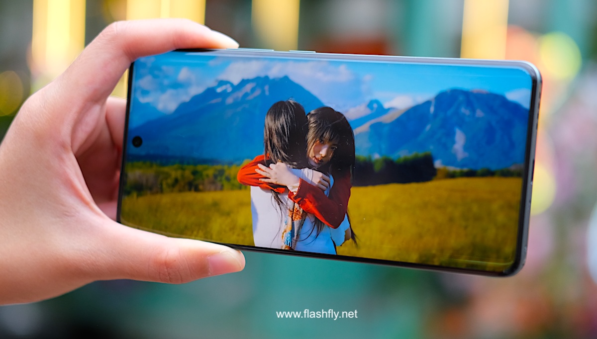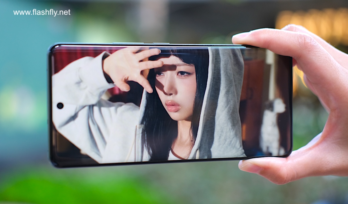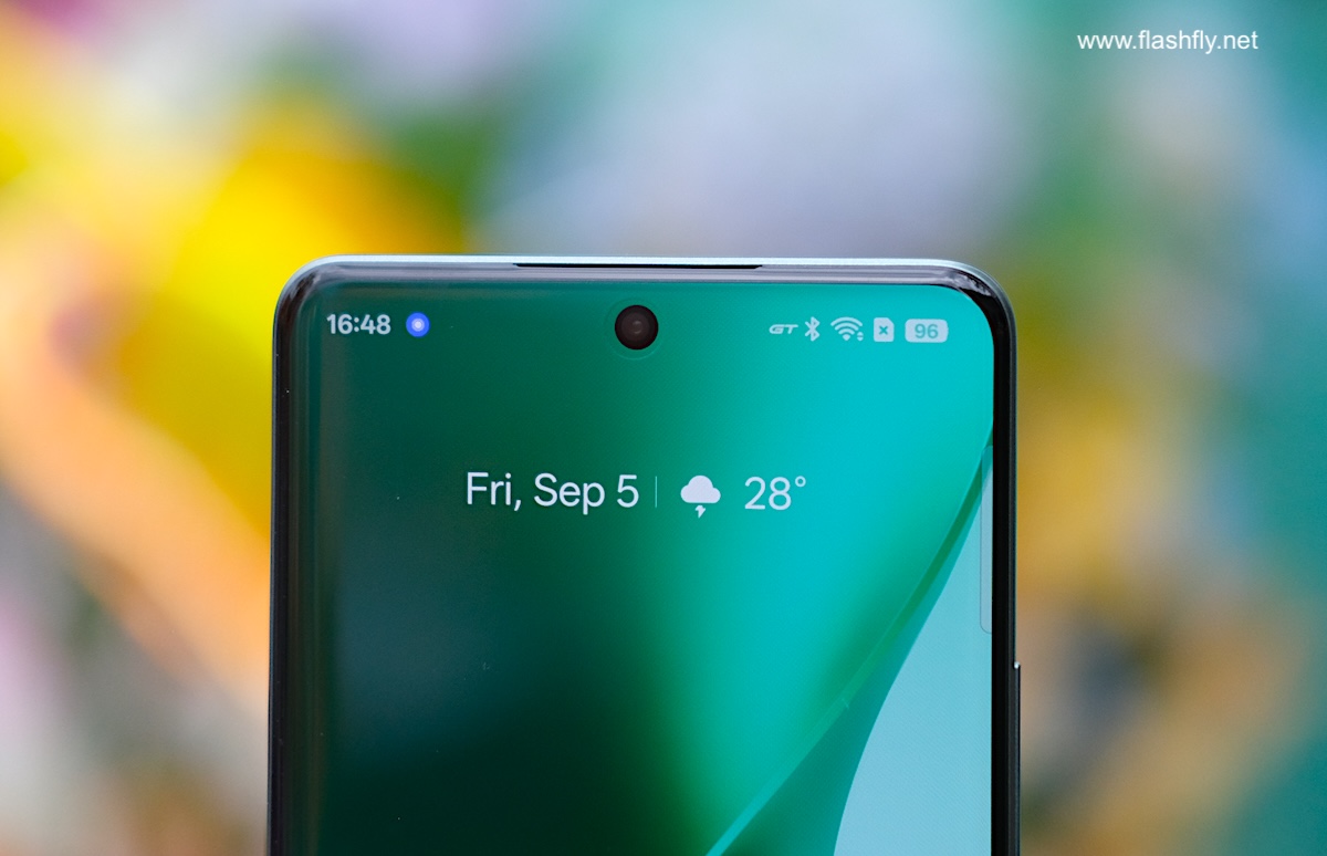 ด้านหน้ามาพร้อมจอแสดงผล AMOLED ขนาด 6.77 นิ้ว และมีกล้องหน้า 50 ล้านพิกเซลที่ขอบด้านบนตัวเครื่อง