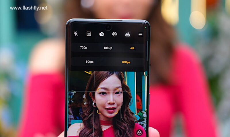 โหมด Video ของกล้องหน้า สามารถถ่ายวิดีโอสูงสุด 4K ที่อัตรา 60 เฟรมต่อวินาที สามารถปรับระยะการซูมได้ 3 ระยะ 0.8x, 1x และ 2x รองรับฟีเจอร์ Filters และ Retouch รวมถึงปรับค่า F เพื่อละลายฉากหลัง ขณะที่แถบเครื่องมือด้านบนมีไอคอนสำหรับปรับค่าชดเชยแสง EV และเปิดระบบป้องกันภาพสั่นไหว