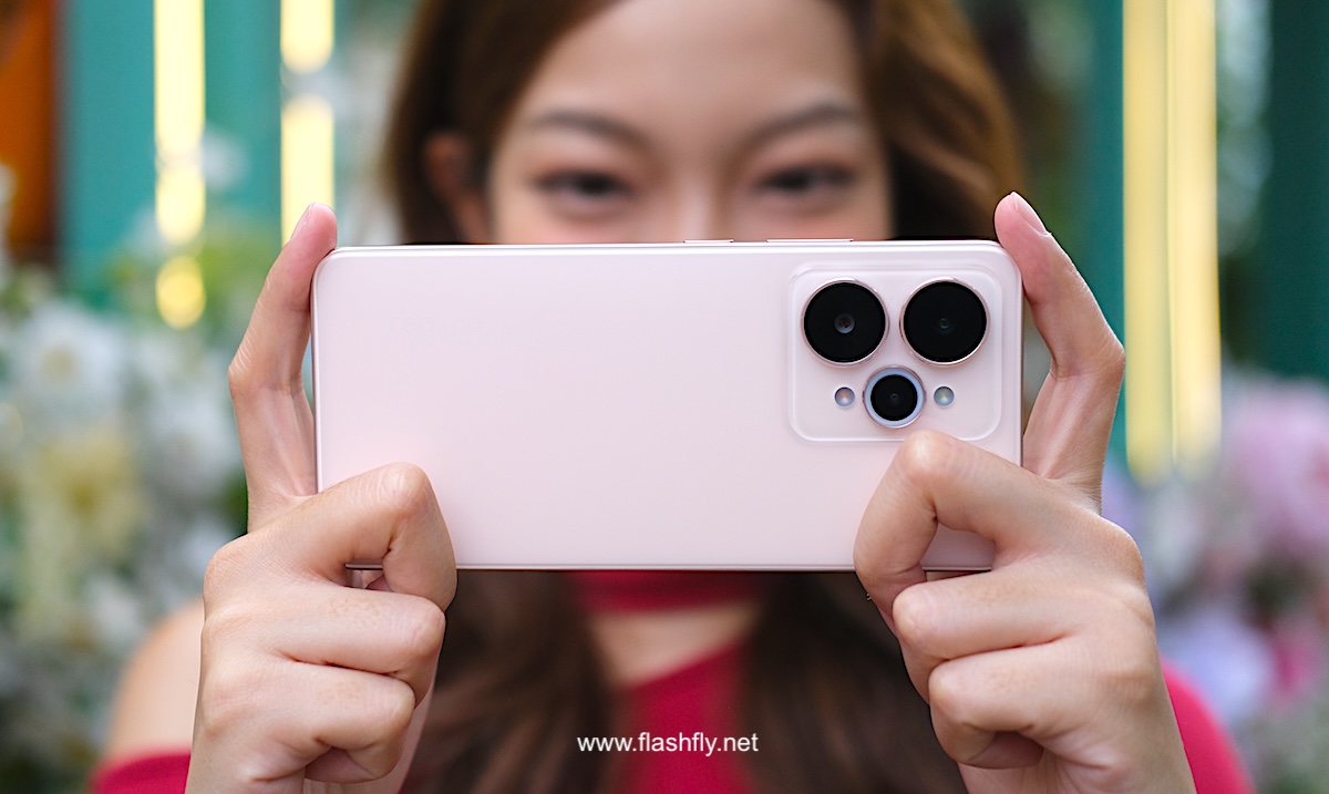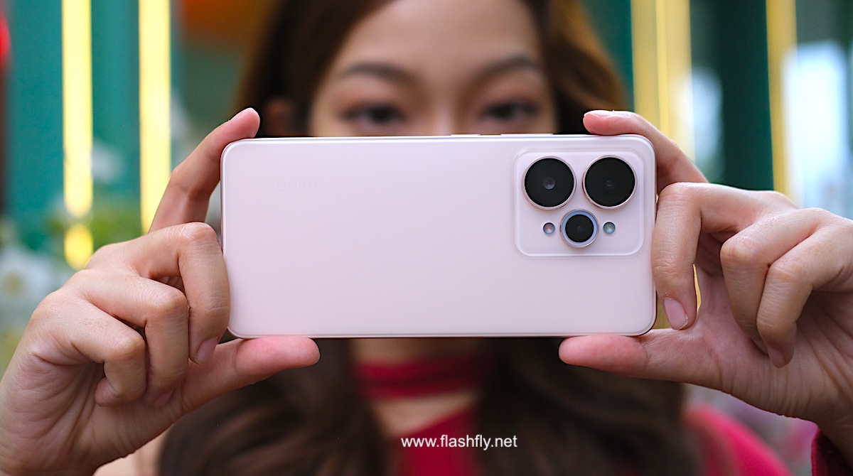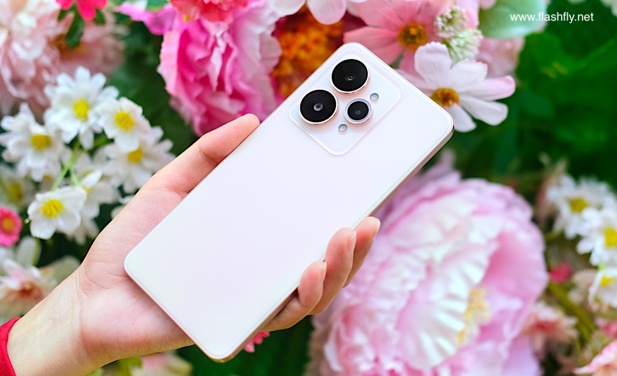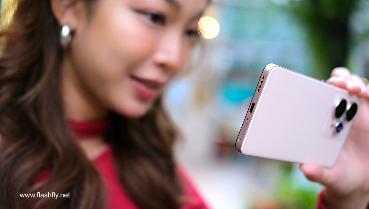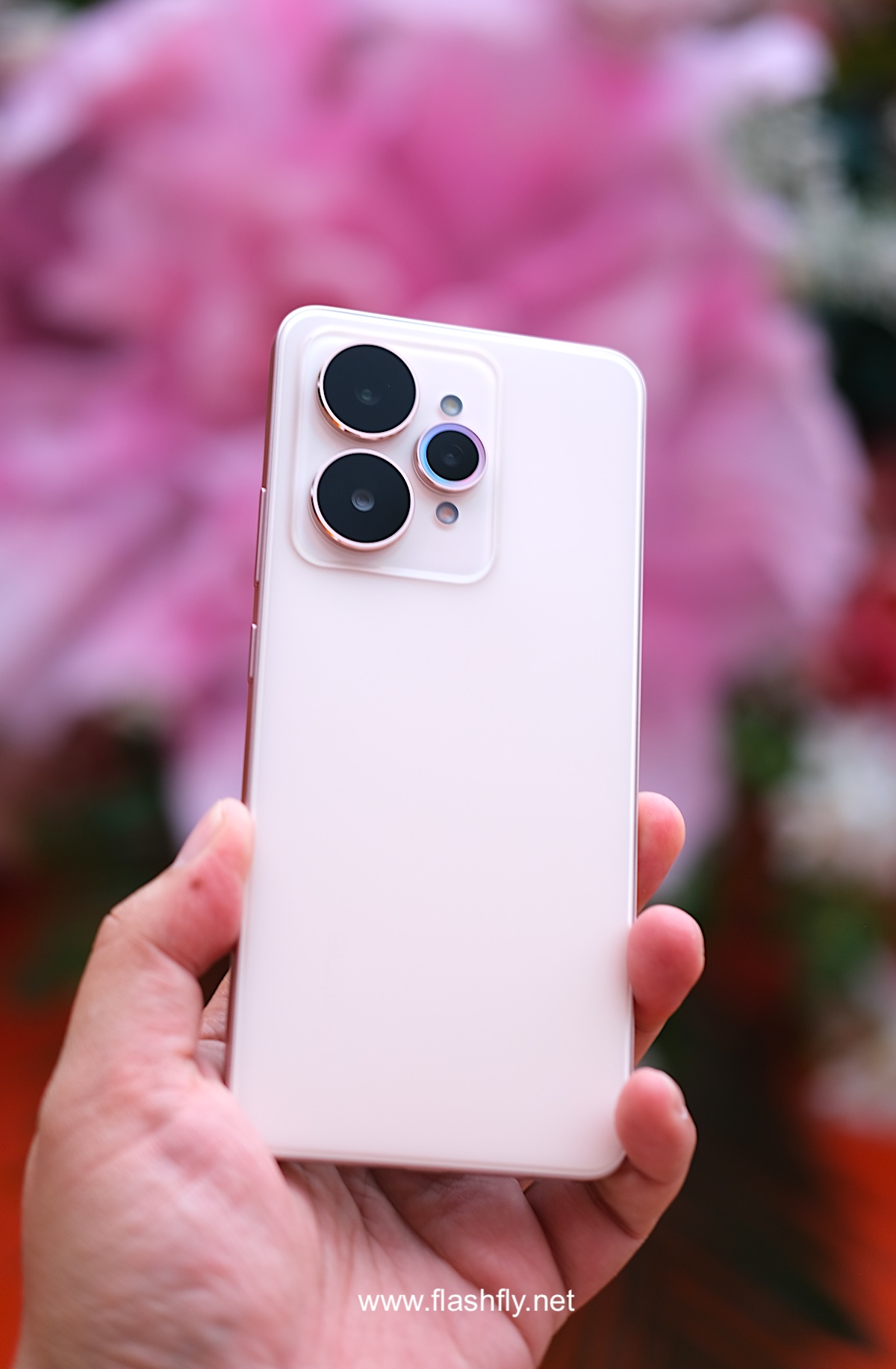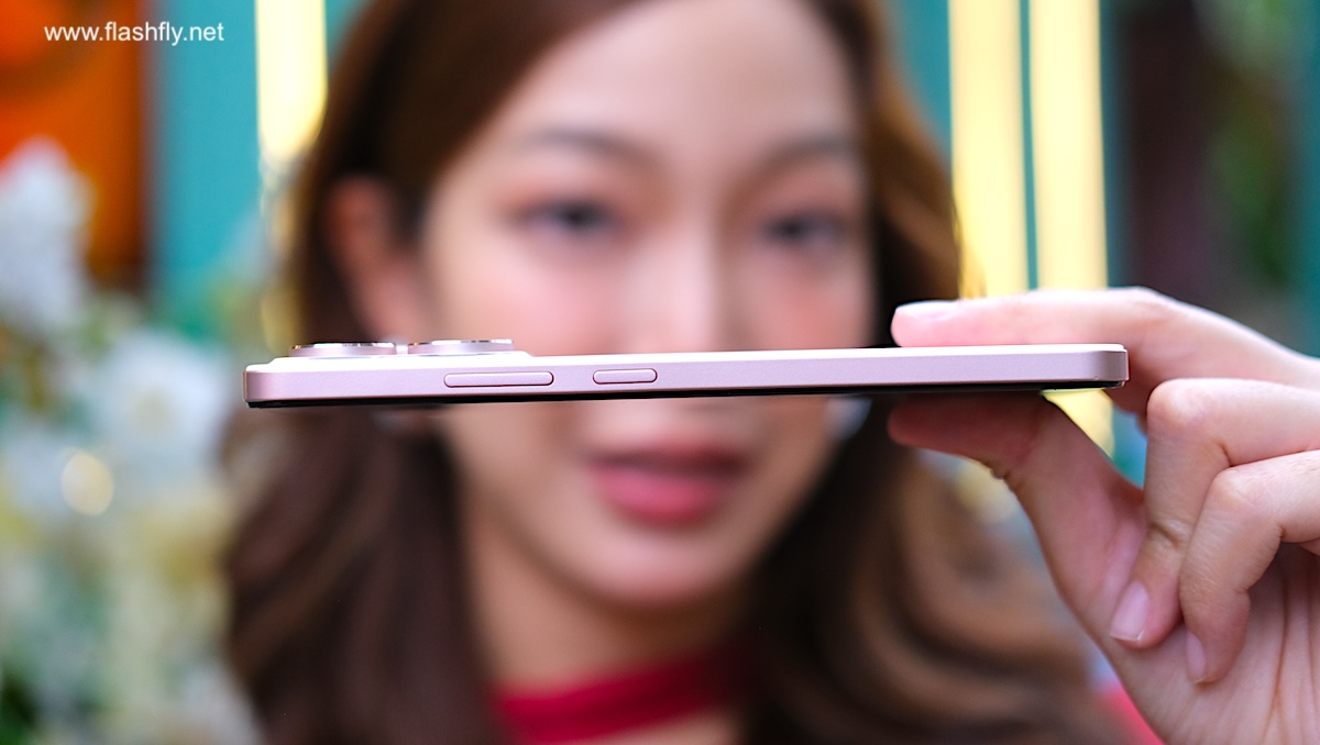 นอกเหนือจากสีสันที่ต่างออกไป ดีไซน์โดยรวมของ realme 15 5G ได้รับการถ่ายทอดความเป็นแฟชันชั้นสูงโอตกูตูร์ เช่นเดียวกับรุ่น Pro องค์ประกอบต่างๆ ก็ดูคล้ายกัน โดยมีให้เลือก 2 สี ได้แก่ Suit Titanium และ Silk Pink ซึ่งทีมงาน @flashfly ได้รับสีชมพู Silk Pink มารีวิว เป็นเฉดสีที่สดใส จำลองมาจากความพริ้วไหวของผ้าไหมสีชมพู
