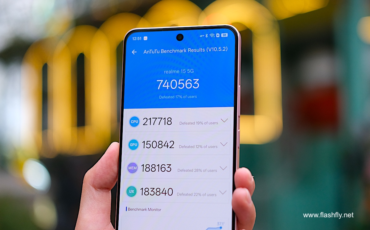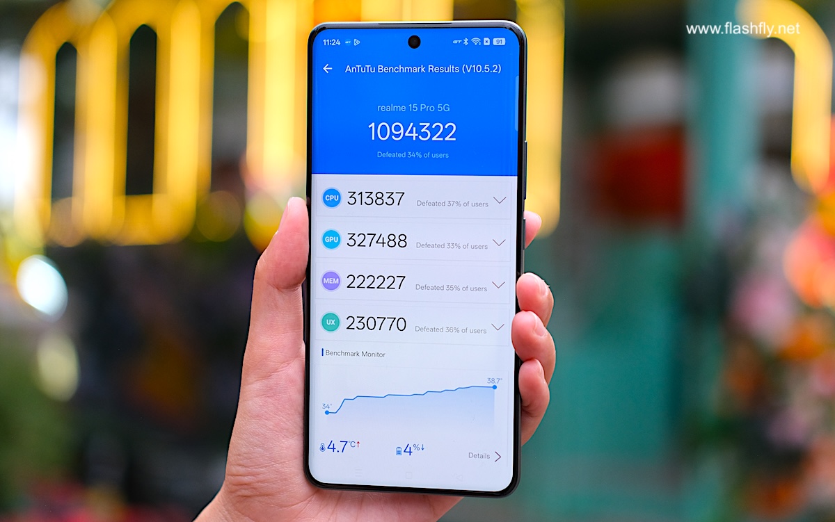จากการทดสอบประสิทธิภาพพบว่า realme 15 Pro 5G สามารถทำคะแนนจากแอปพลิเคชัน AnTuTu ทะลุ 1 ล้านคะแนน โดยจำแนกเป็นคะแนนด้าน CPU ทำได้ 313,837 คะแนน, GPU ทำได้ 327,488 คะแนน, Memory ทำได้ 222,227 คะแนน และด้าน User Experience ทำได้ 230,770 คะแนน