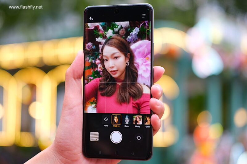 ถัดลงมาจากไอคอน Light Effect เป็นฟีเจอร์ Soft Light ซึ่งทำงานร่วมกับแฟลช ประกอบด้วยเอฟเฟกต์ Deja vu, Retro, Misty, Glowy และ Dreamy โดย 2 แบบแรกจะเป็นการเปิดไฟแฟลชคู่ที่ด้านหลังสำรับถ่ายตอนกลางคืนอีกด้วย