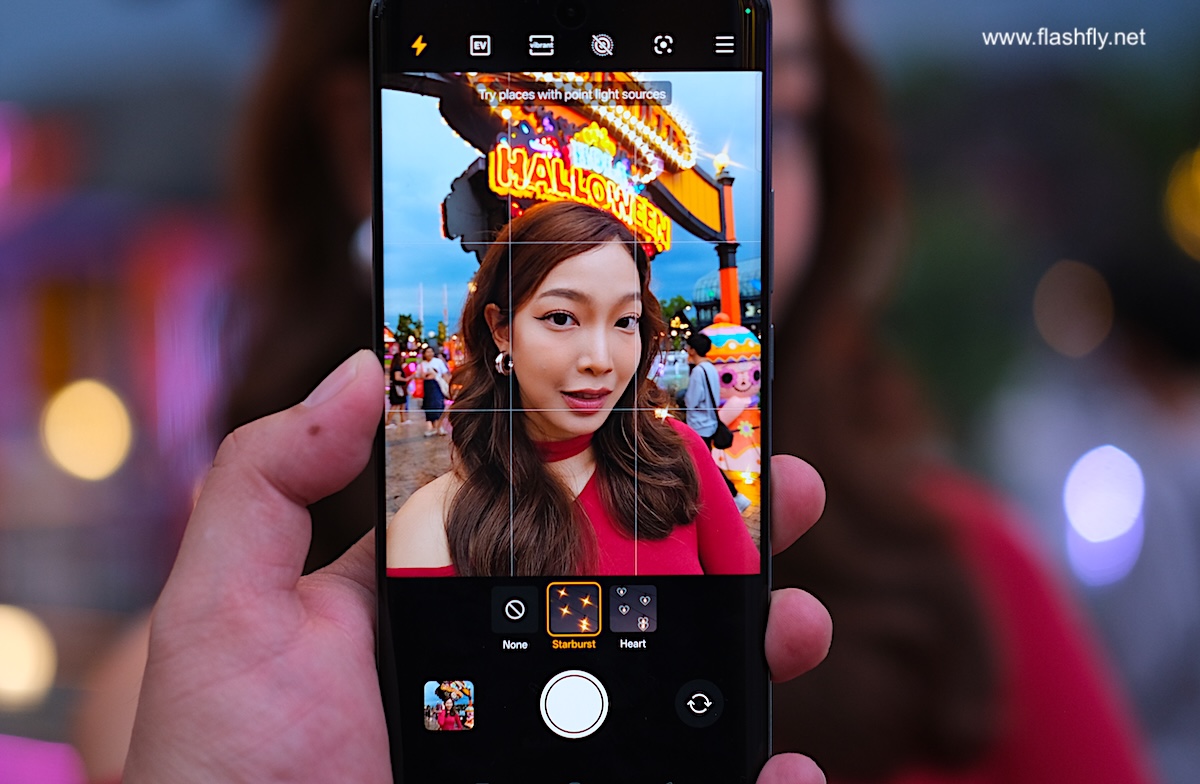 โหมด Photo รองรับการซูมที่ระยะ 0.6x, 1x, 2x จนสูงสุด 20x มาพร้อมฟีเจอร์ Light Effect ทำให้ภาพถ่ายในงานปาร์ตี้โดดเด่นยิ่งขึ้น ด้วยการเพิ่มเอฟเฟกต์ที่มีให้เลือก 2 แบบ Starburst และ Heart